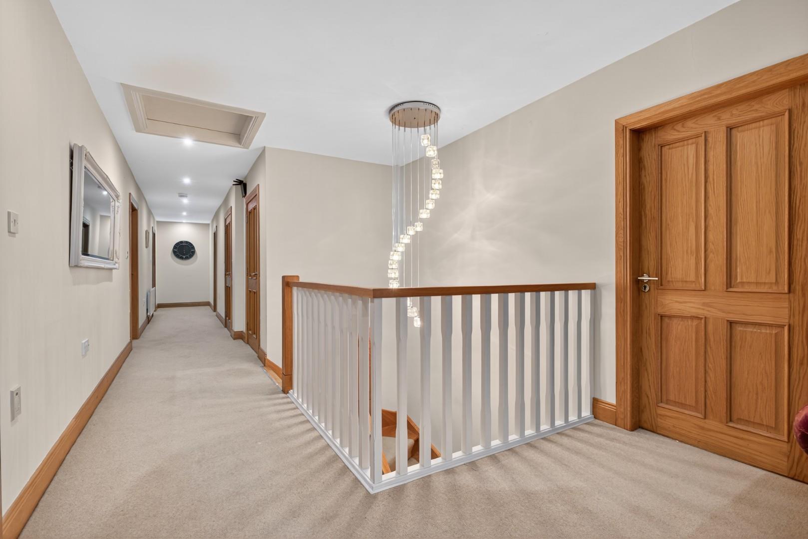 The first floor offers a large, inviting landing, a master bedroom with walk-in wardrobe and en-suite bathroom, three further double bedrooms (all en-suite), a steam room, an additional bathroom, and ample storage throughout.