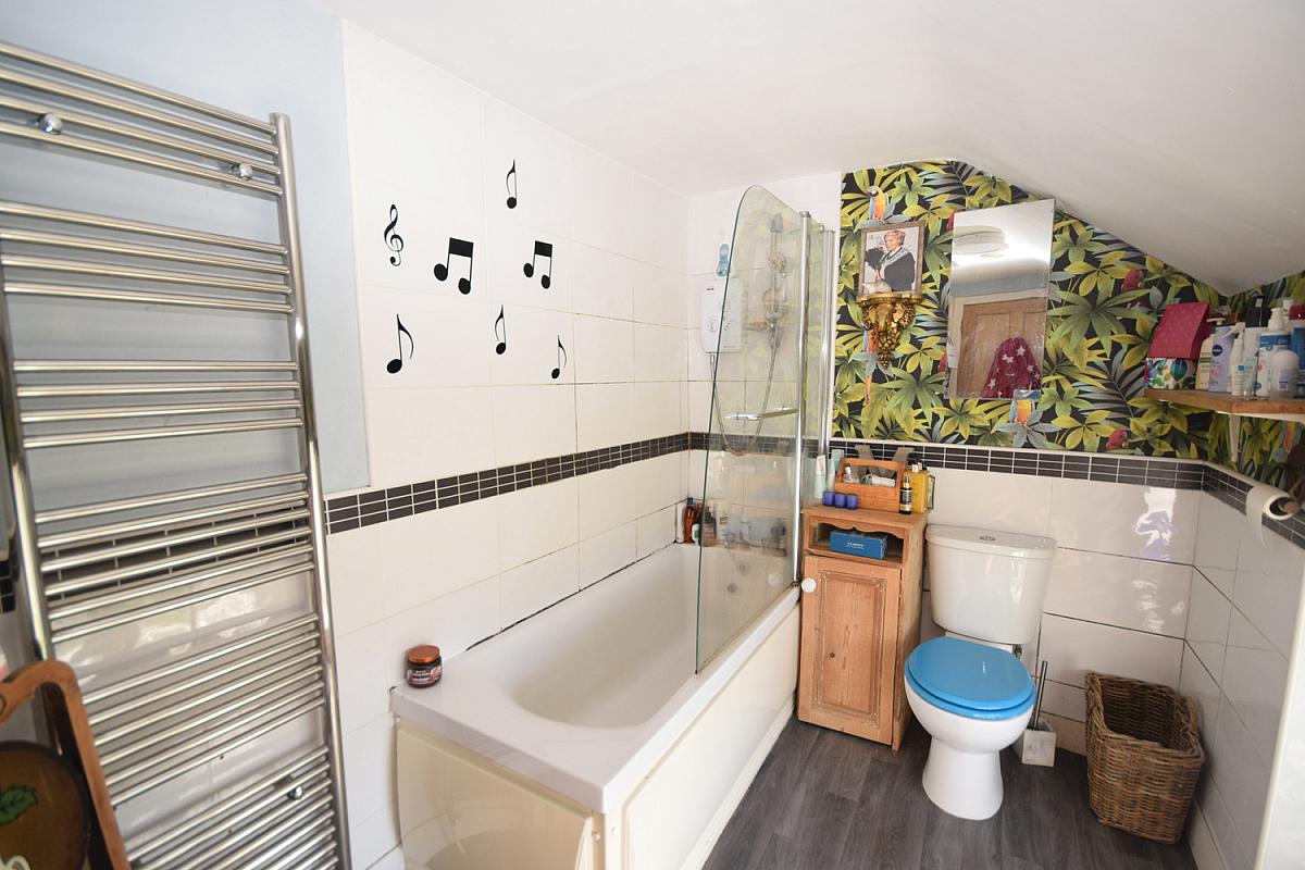 104 x 56 Includes a white three-piece suite comprising WC, wash hand basin, and bath with overhead electric shower, finished with wooden laminate flooring.