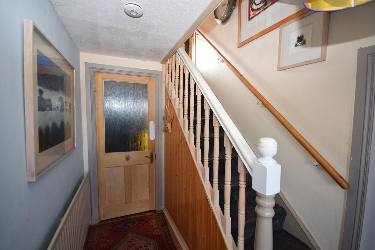 To the rear, a porch area provides additional storage with a shelved larder and durable slate flooring.