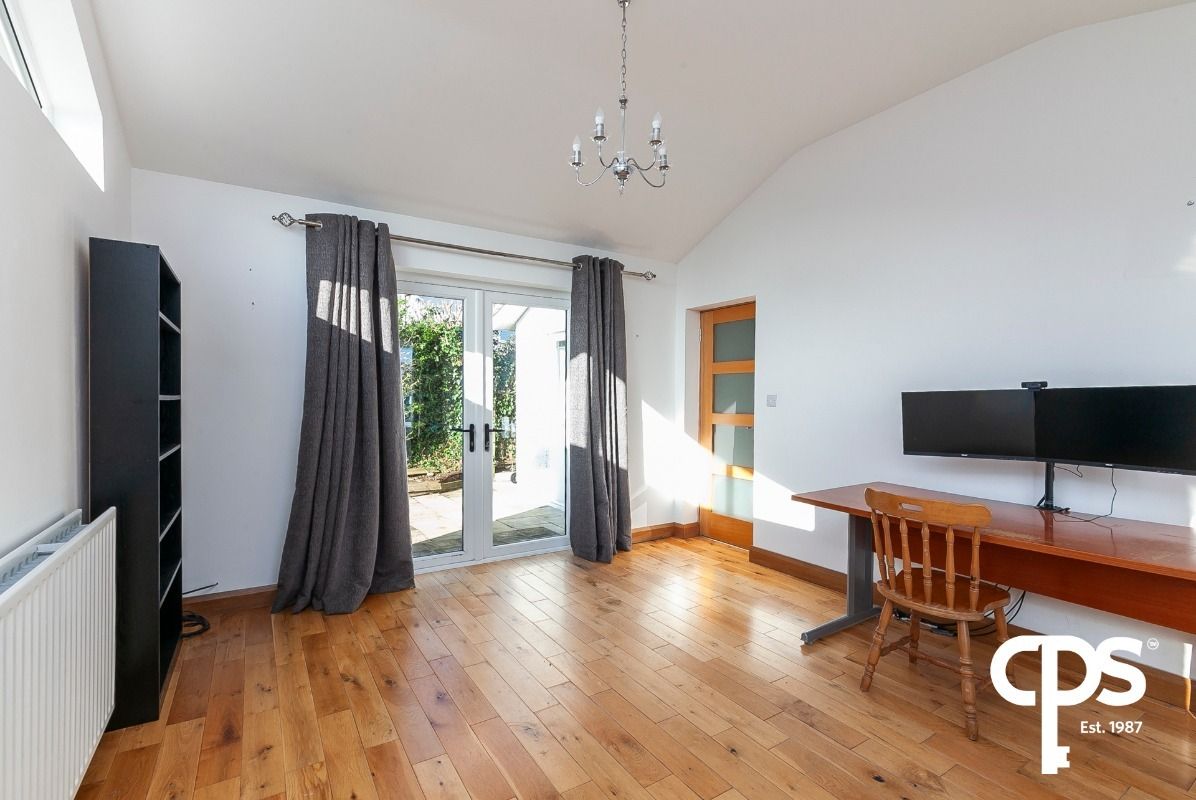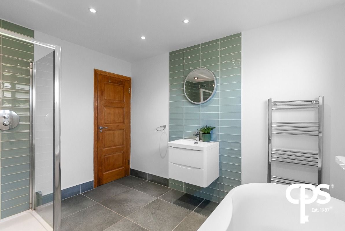 This modern kitchen boasts ample amount of storage, fully fitted with high and low units, integrated appliances and an island. This open layout allows for easy flow to the rest of this substantial home.