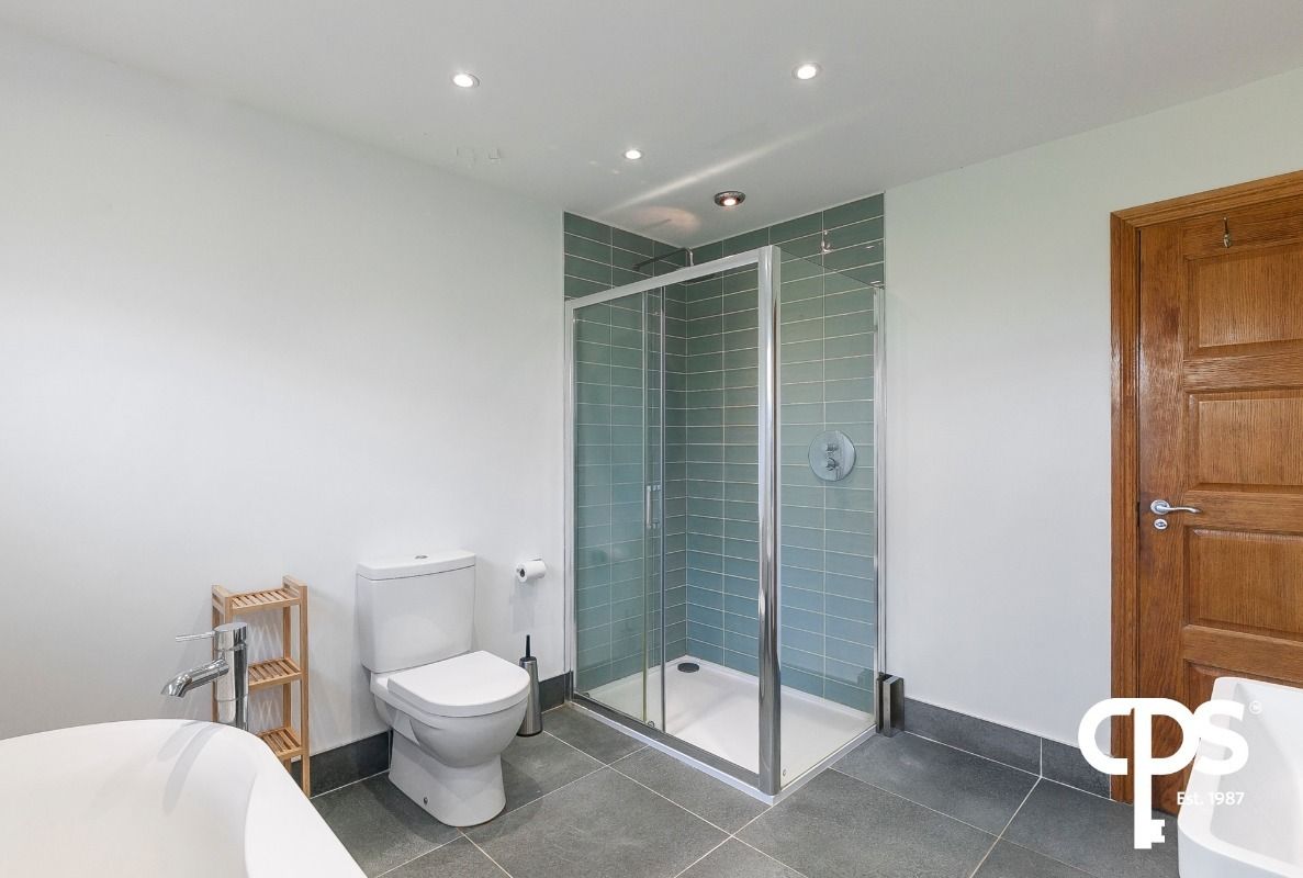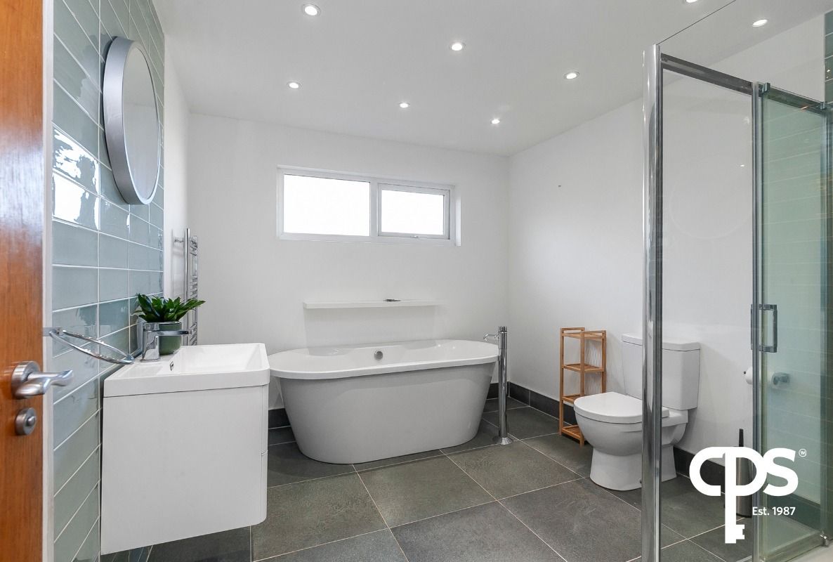 This stunning contemporary bathroom features a four-piece suite including a sleek bathtub, shower and sink in elegant vanity unit, with a features tiled splashback and a white w/c.