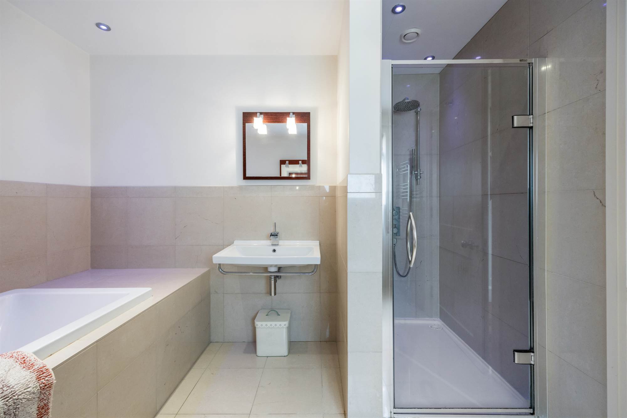 Raised panelled bath, separate shower enclosure, low flush WC, twin wash hand basin vanity unit