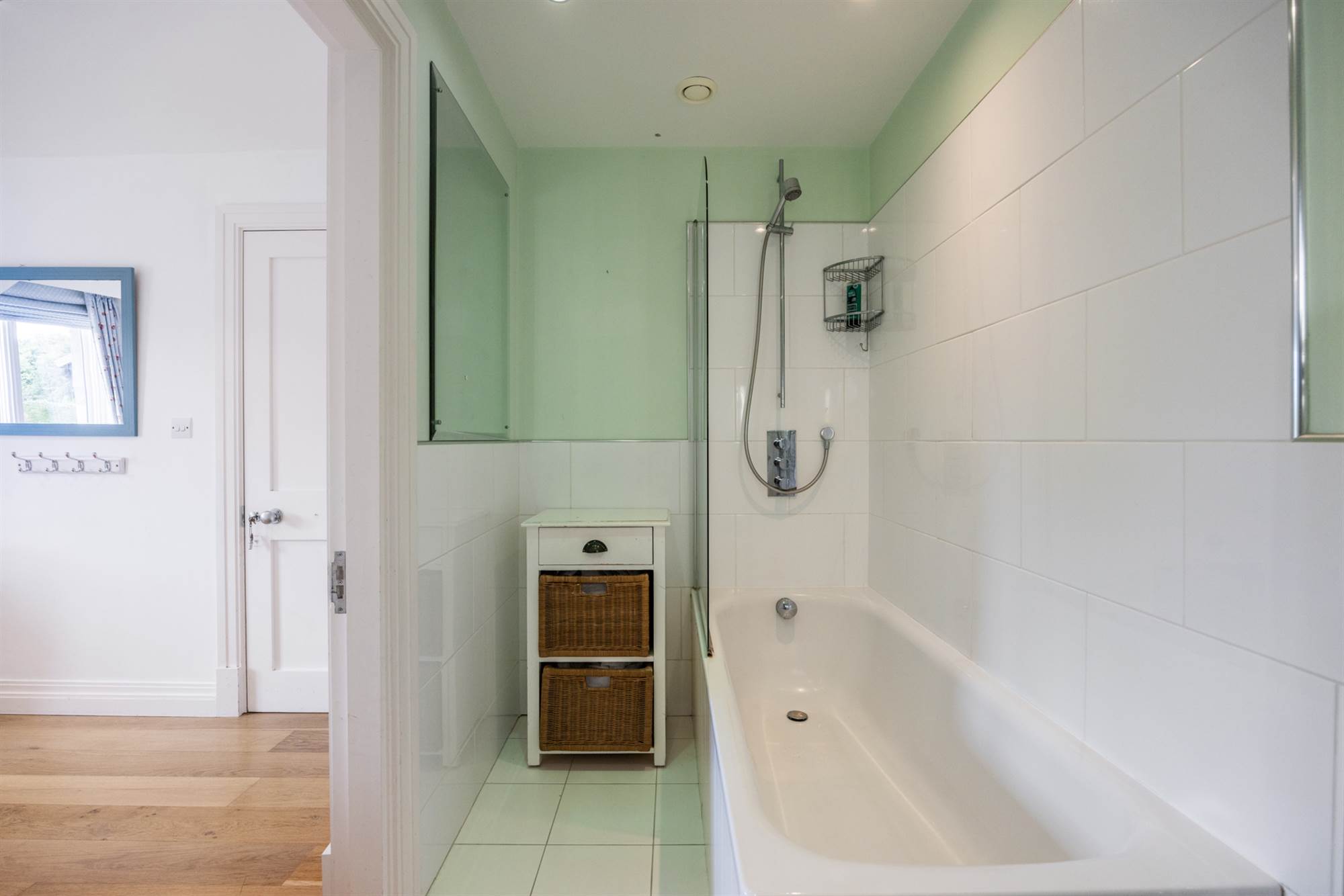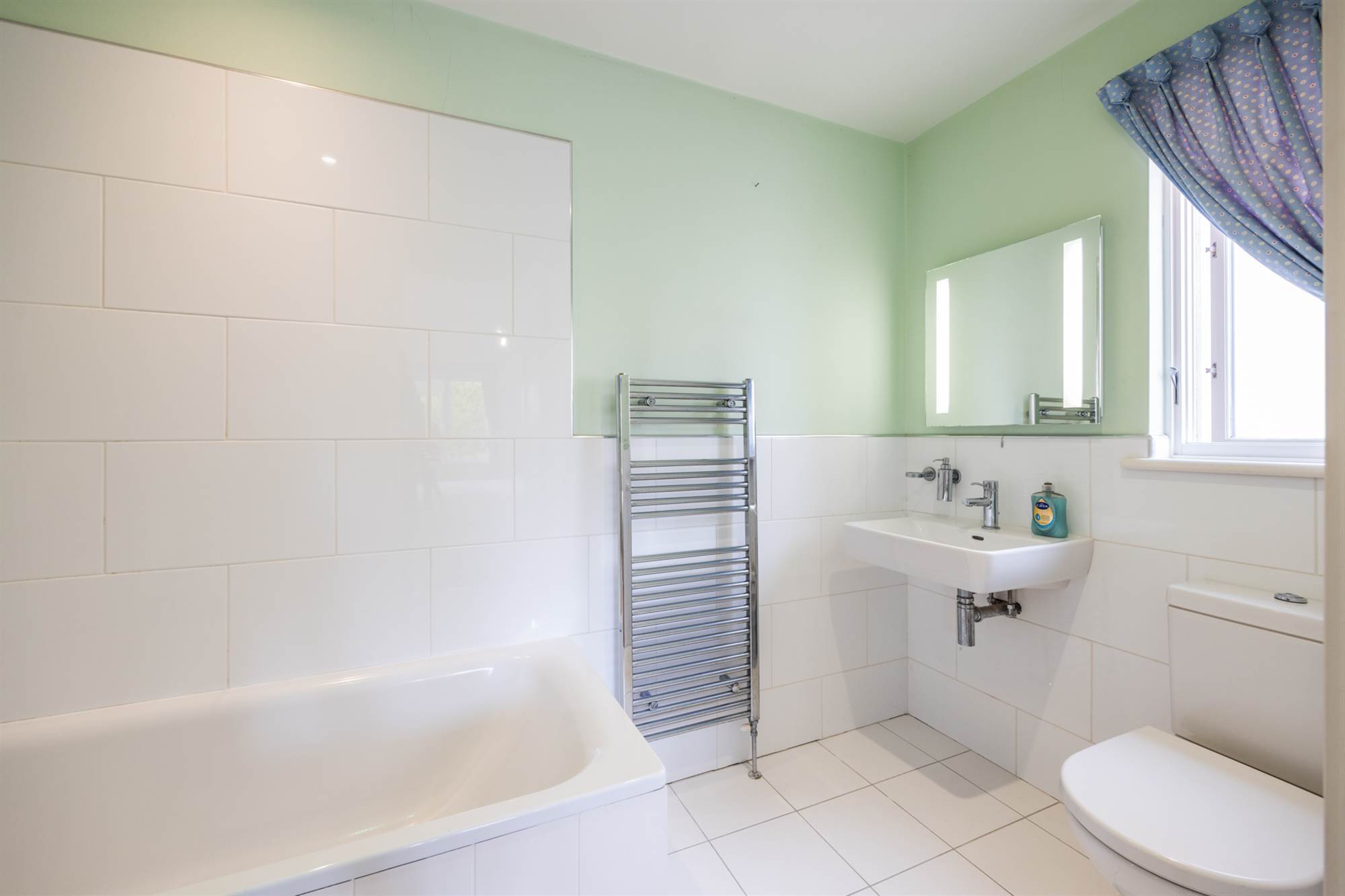 White suite, panelled bath, mixer taps, telephone hand shower, low flush WC, wash hand basin