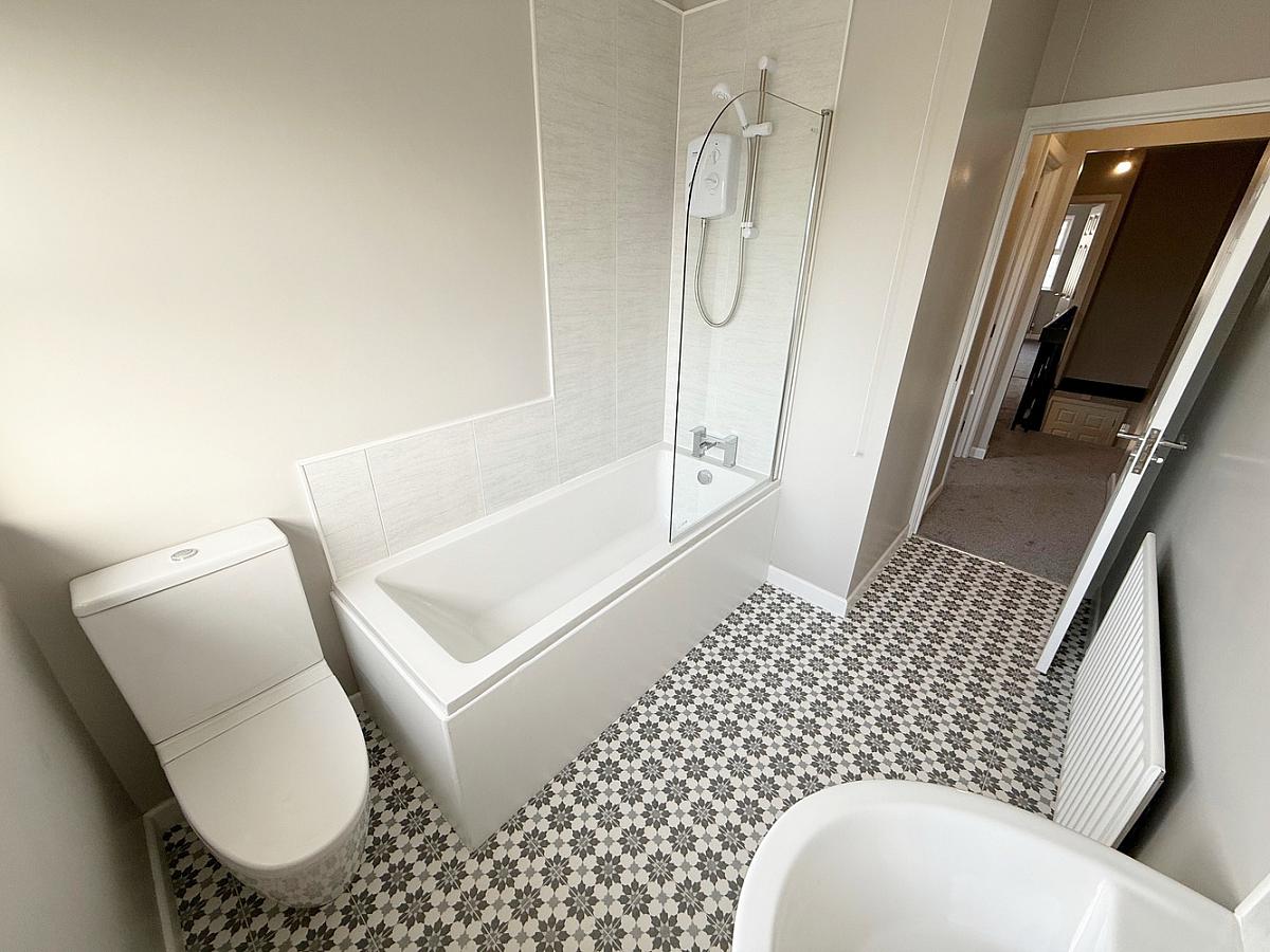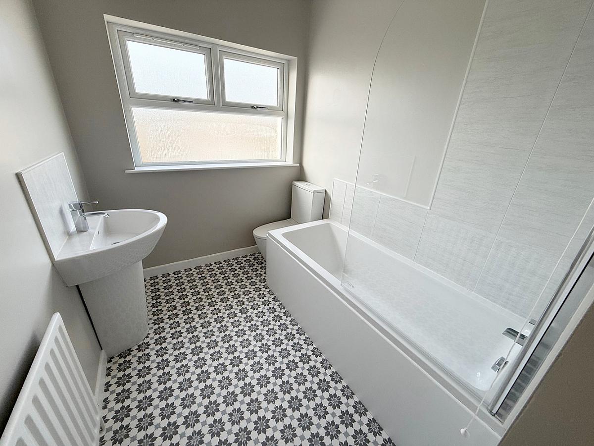 Comprising panel bath with mixer taps, electric shower over, low flush WC and pedestal wash hand basin.