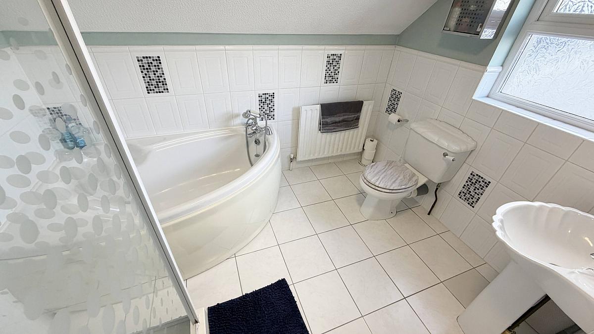 Low flush WC, pedestal wash hand basin, shower cubicle with electric shower, corner bath.