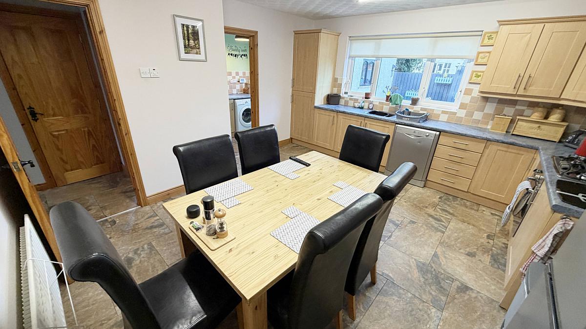 Tiled floor, high and low level storage units, stainless steel sink and drainer unit, television point, space for fridge freezer, integrated oven with gas hob extractor, plumbed for dishwasher.