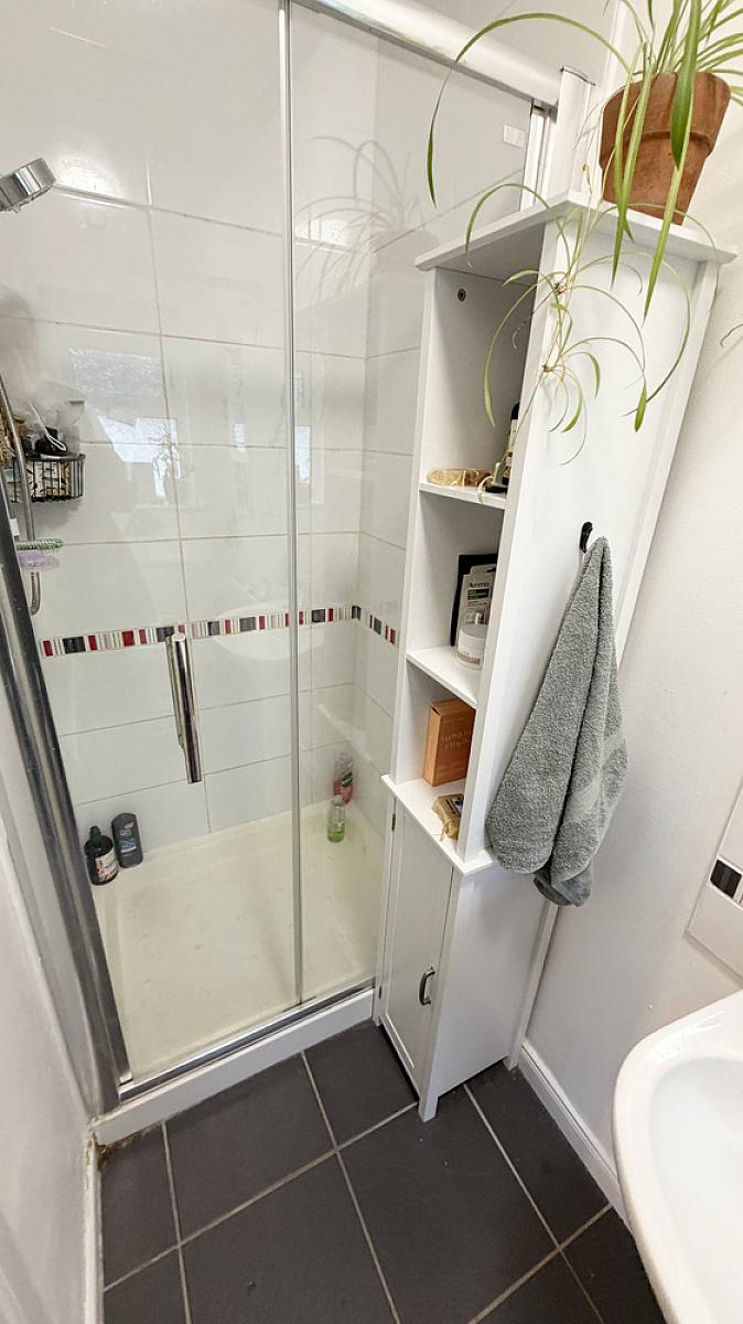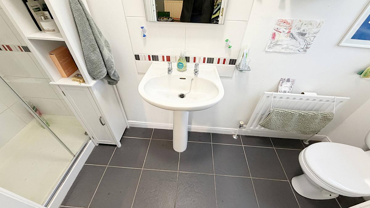 Tiled floor, shower cubicle electric shower, pedestal wash hand basin, low flush WC.