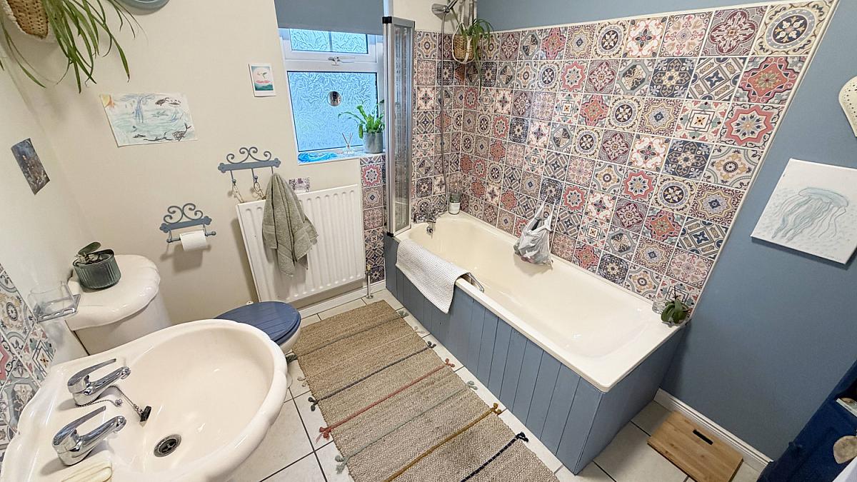 Tiled floor, low flush WC, pedestal wash hand basin, paneled bath with shower attachment