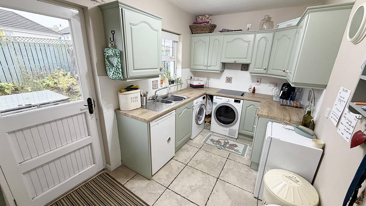 Tiled floor, high and low level storage units, integrated hob, plumbed for washing machine, stainless steel sink drainer unit, space for tumble drier.