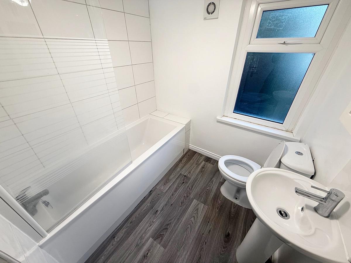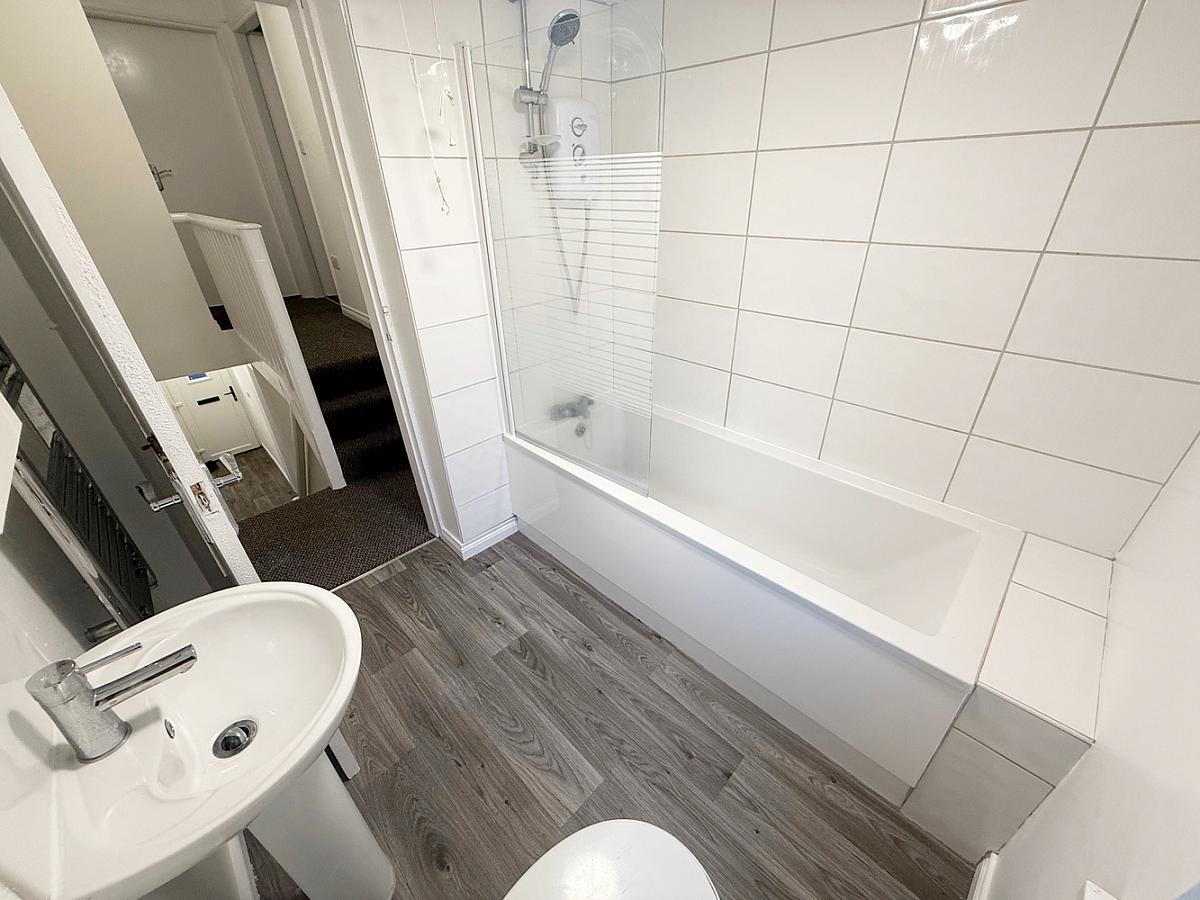 Panelled bath, electric shower over with glass screen, low flush WC, wash hand basin, extractor fan and heated towel rail.