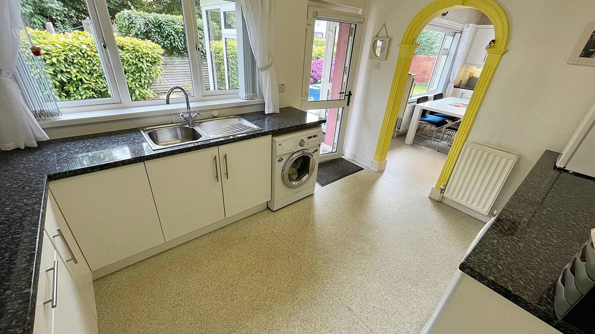 High and low level storage units, plumbed for washing machine, space for tumble dryer, single stainless steel sink, space for fridge with access to rear sun porch.
