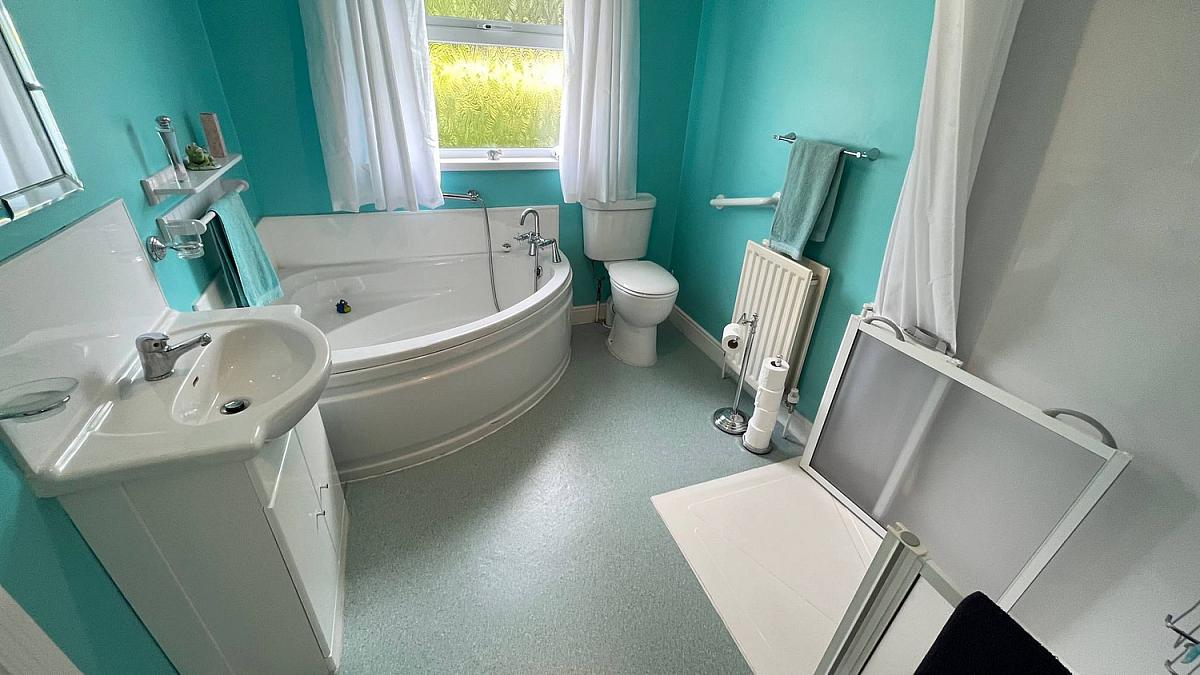 Walk in shower with mains shower, wash hand basin, corner bath, low flush WC.