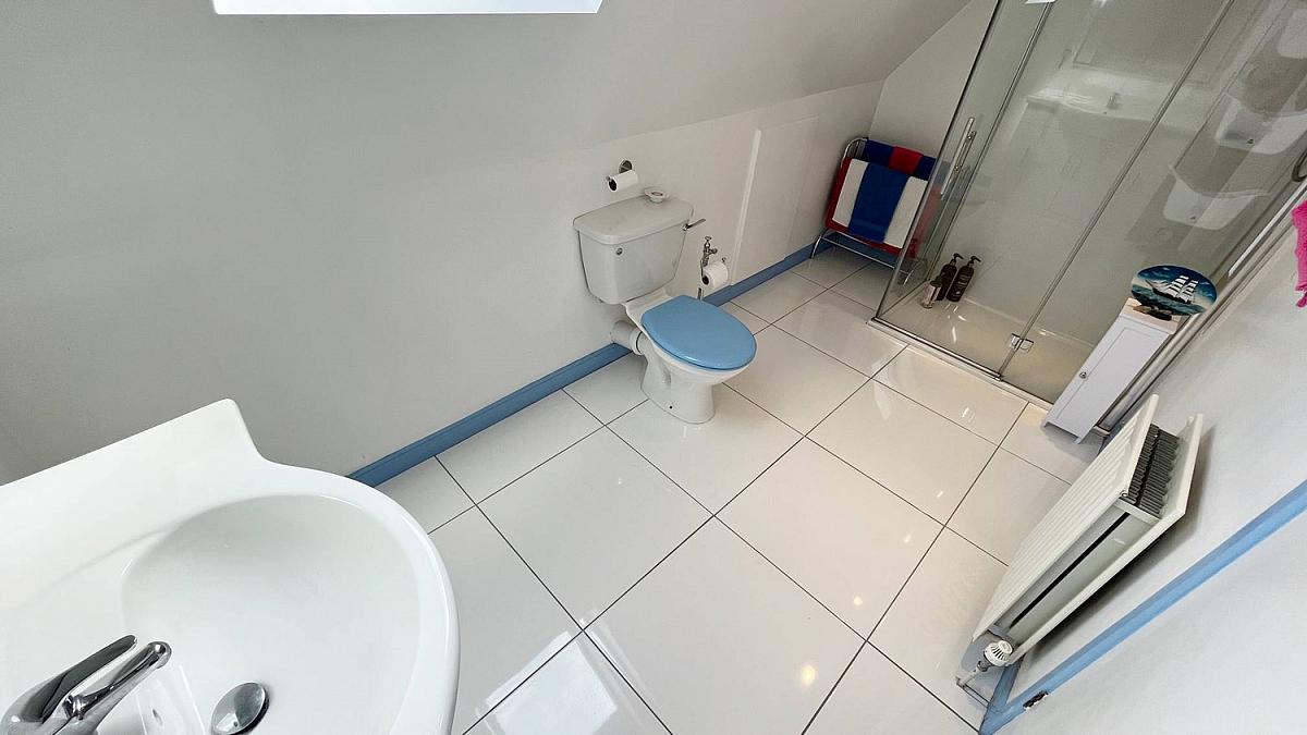 Tiled floor, low flush WC, vanity unit wash hand basin, shower cubicle with electric shower.