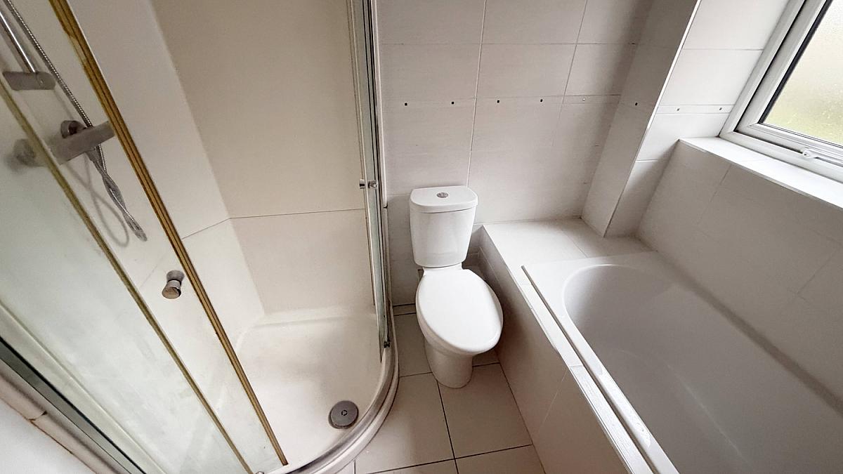 Tiled floor, low flush WC, cantilever wash hand basin, tiled bath and shower cubicle with mains shower.
