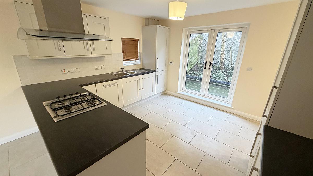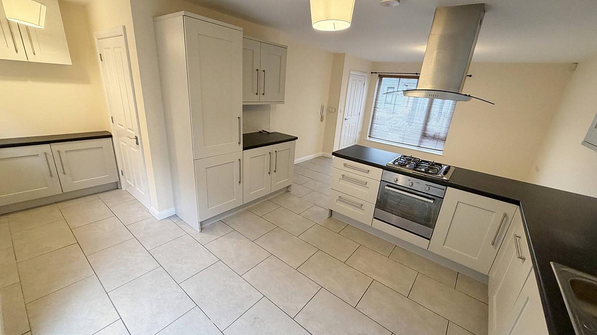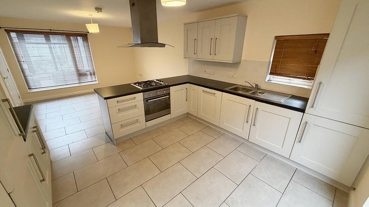 Tiled floor, high and low level storage units, integrated electric oven and gas hob, integrated dish washer, fridge freezer and washer/dryer, double stainless steel sink, intercom and patio door to rear.