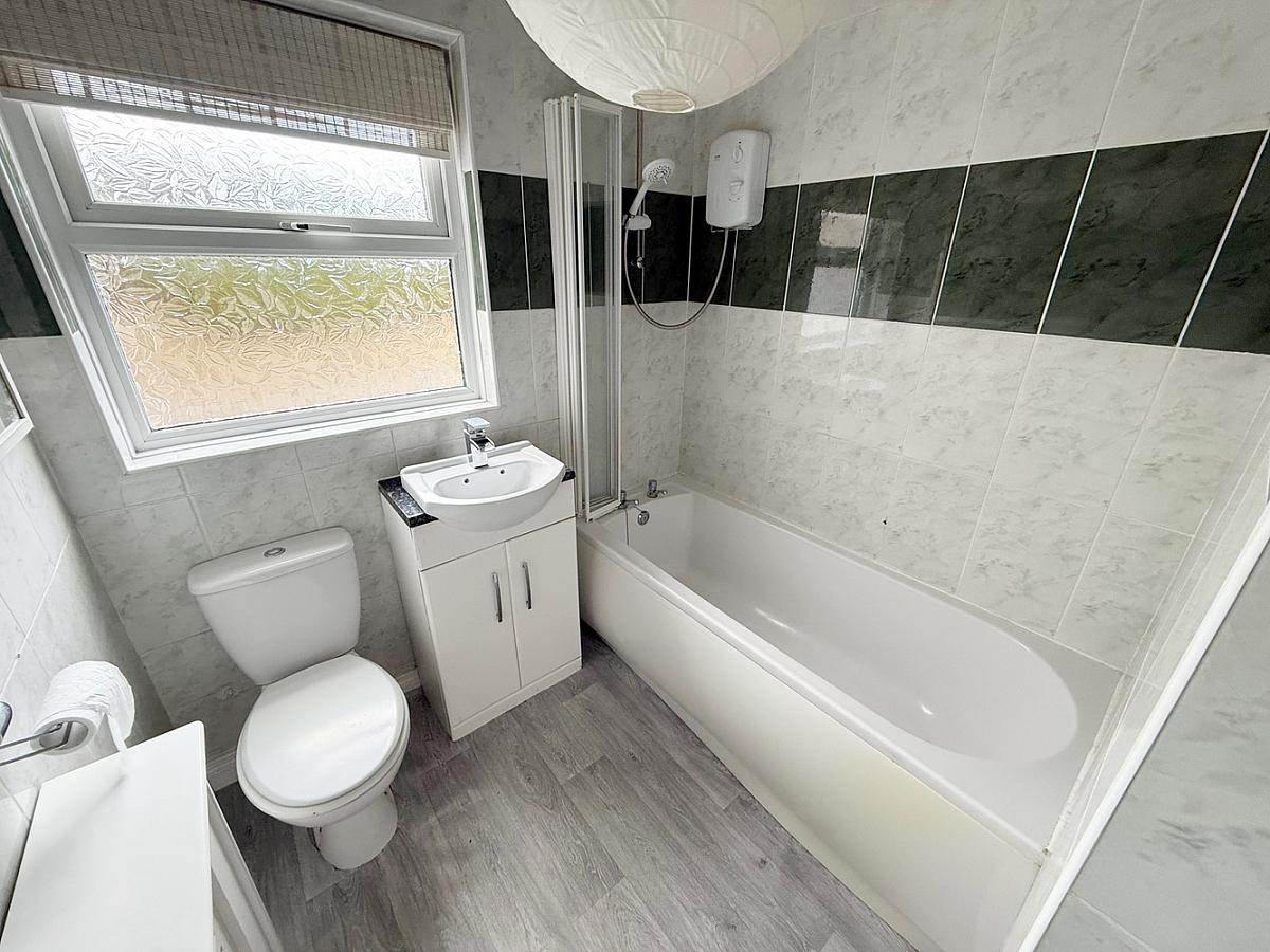 Comprising panel bath with electric shower over, wash hand basin in vanity unit and low flush WC. Tiled walls.