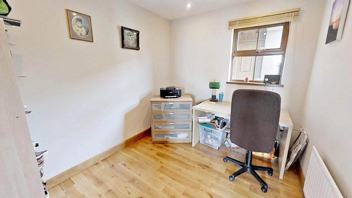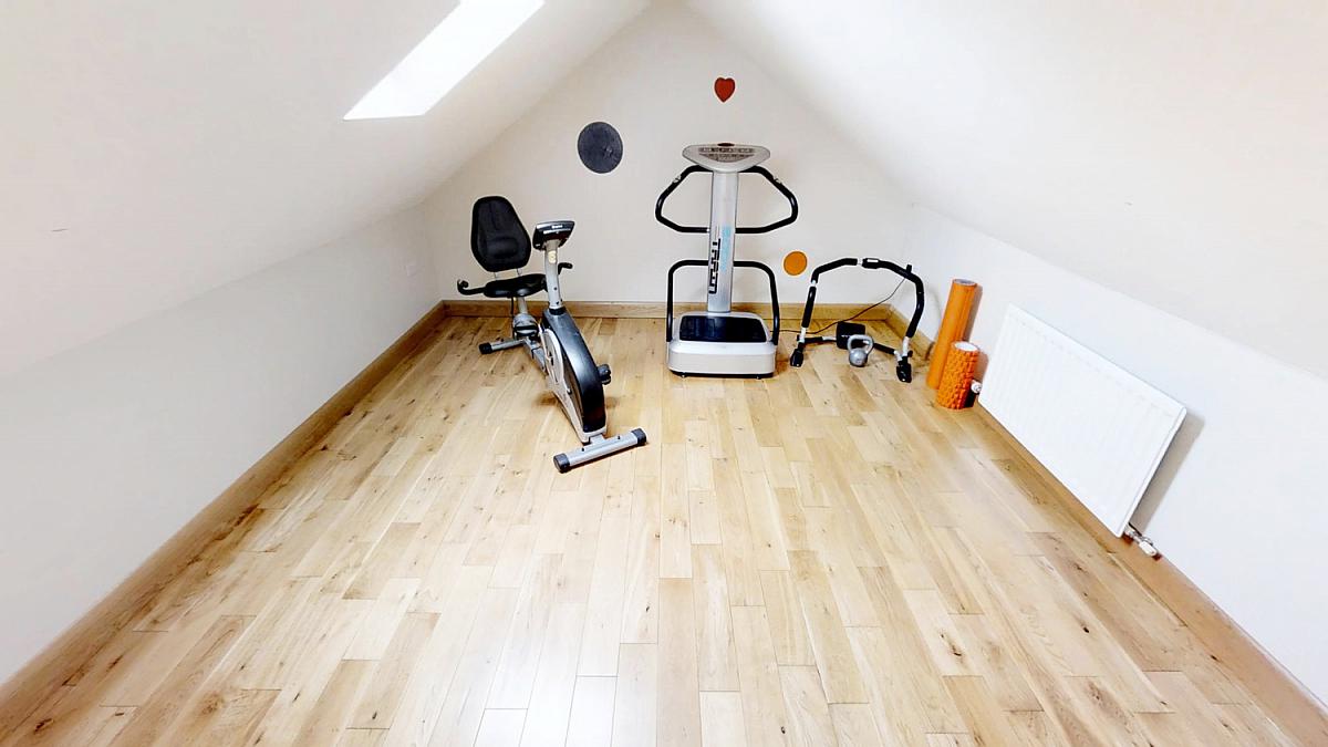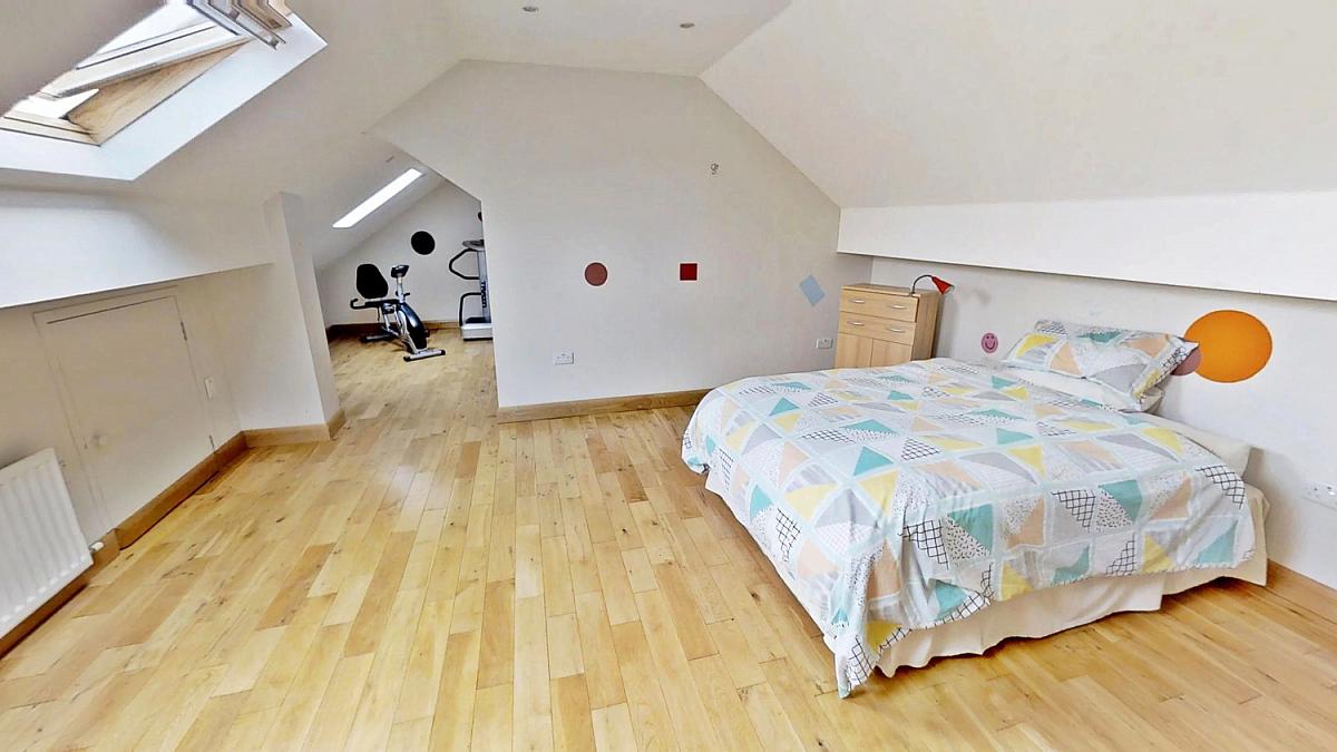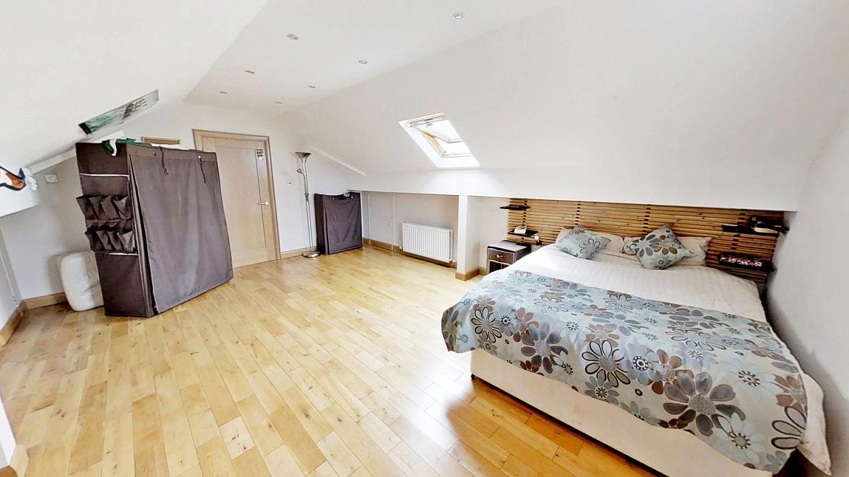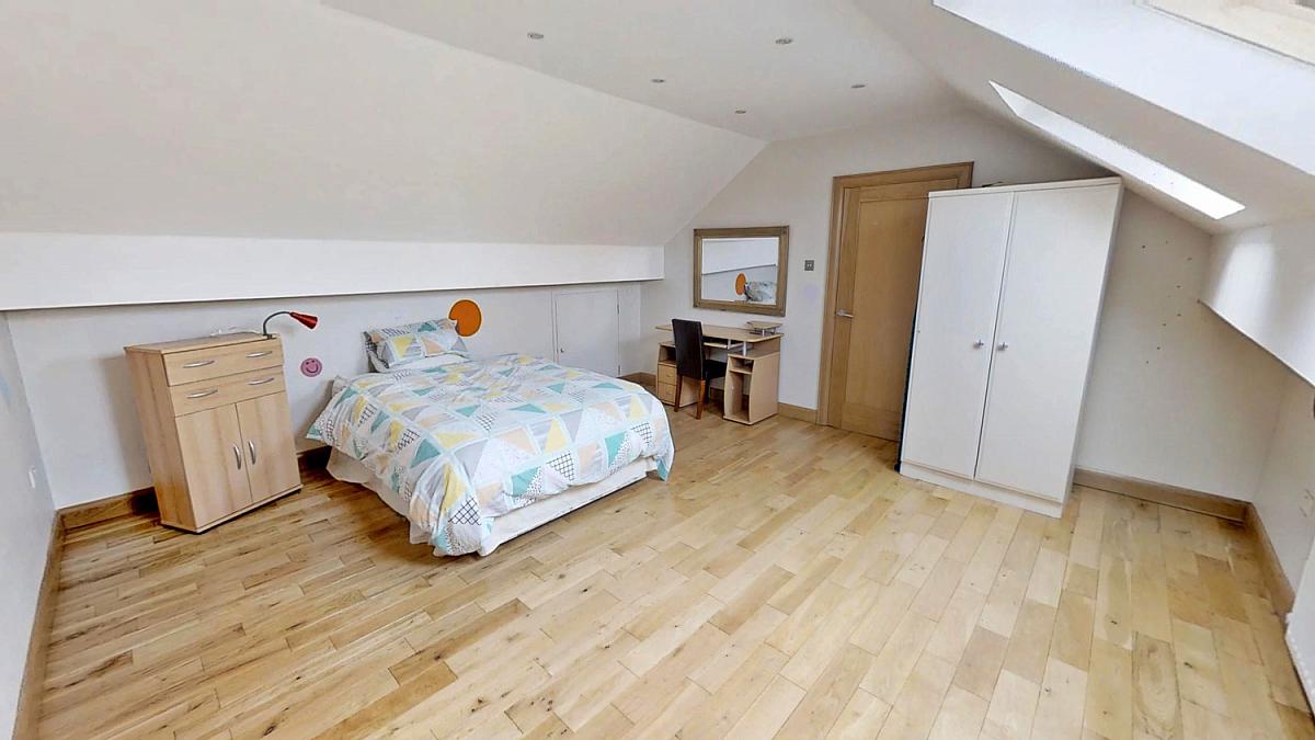 Oak floor, eaves storage (x 2) and velux windows. Television point, vaulted ceiling and recessed lighting.