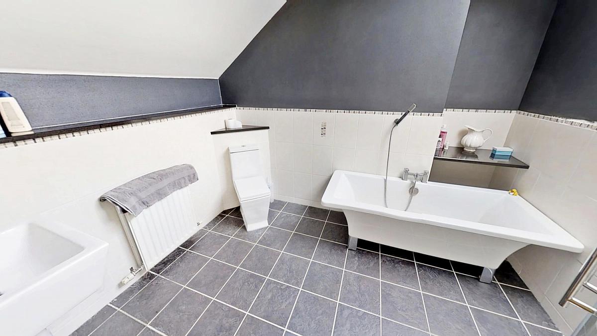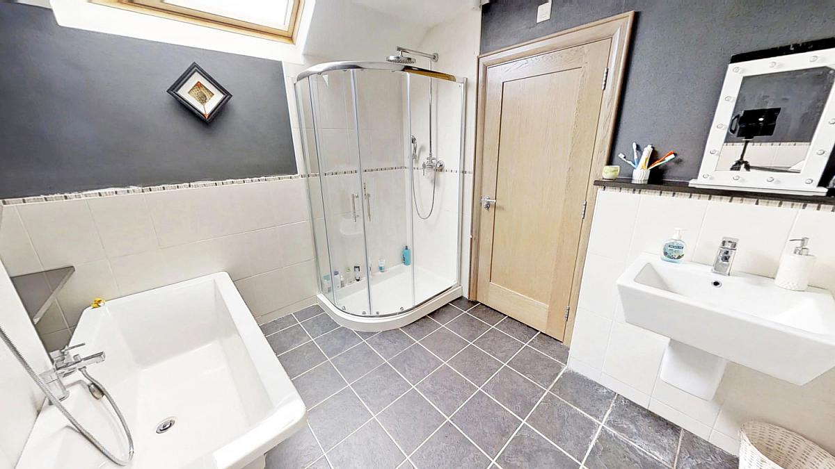 Tiled floor and part timed walls. Low flush WC, cantilever wash hand basin. Free standing bath, shower cubicle with mains shower (Rainwater head). Recessed lighting and velux window.