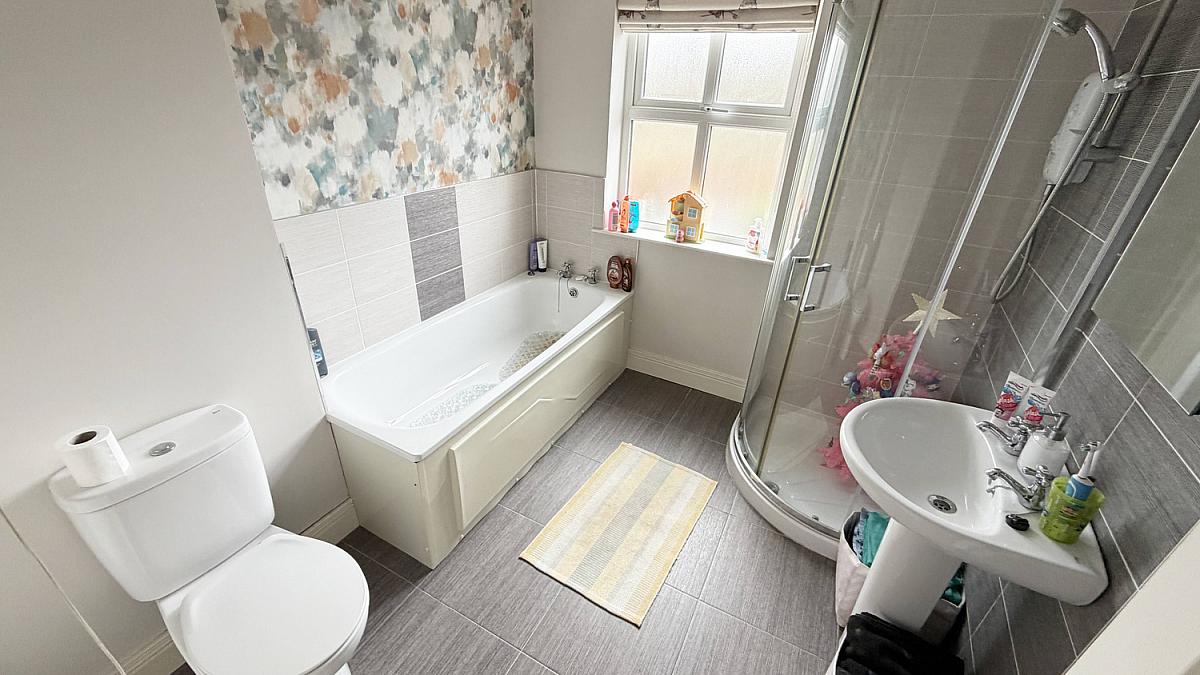 Panel bath, shower cubicle with electric shower, low flush WC, pedestal wash hand basin, extractor fan part tiled walls and tiled floor.