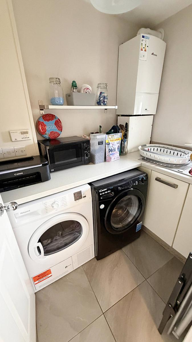Low level units, single drainer stainless steel sink unit, gas boiler, heating controls, plumbed for washing machine, space for tumble dryer, part tiled walls and tiled floor.