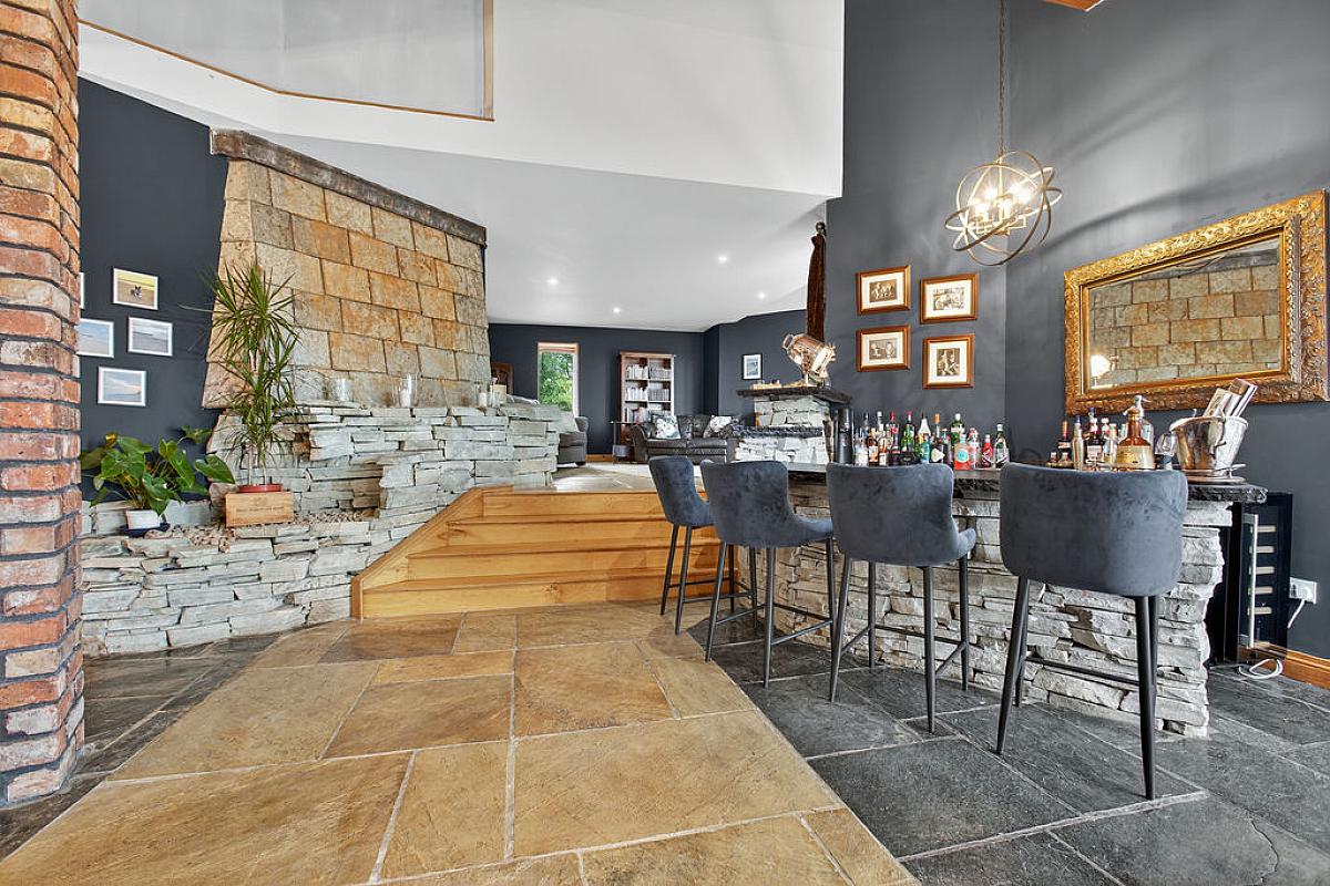 Slate floor, bar area with slate facing and solid wood top. Fridge spaces