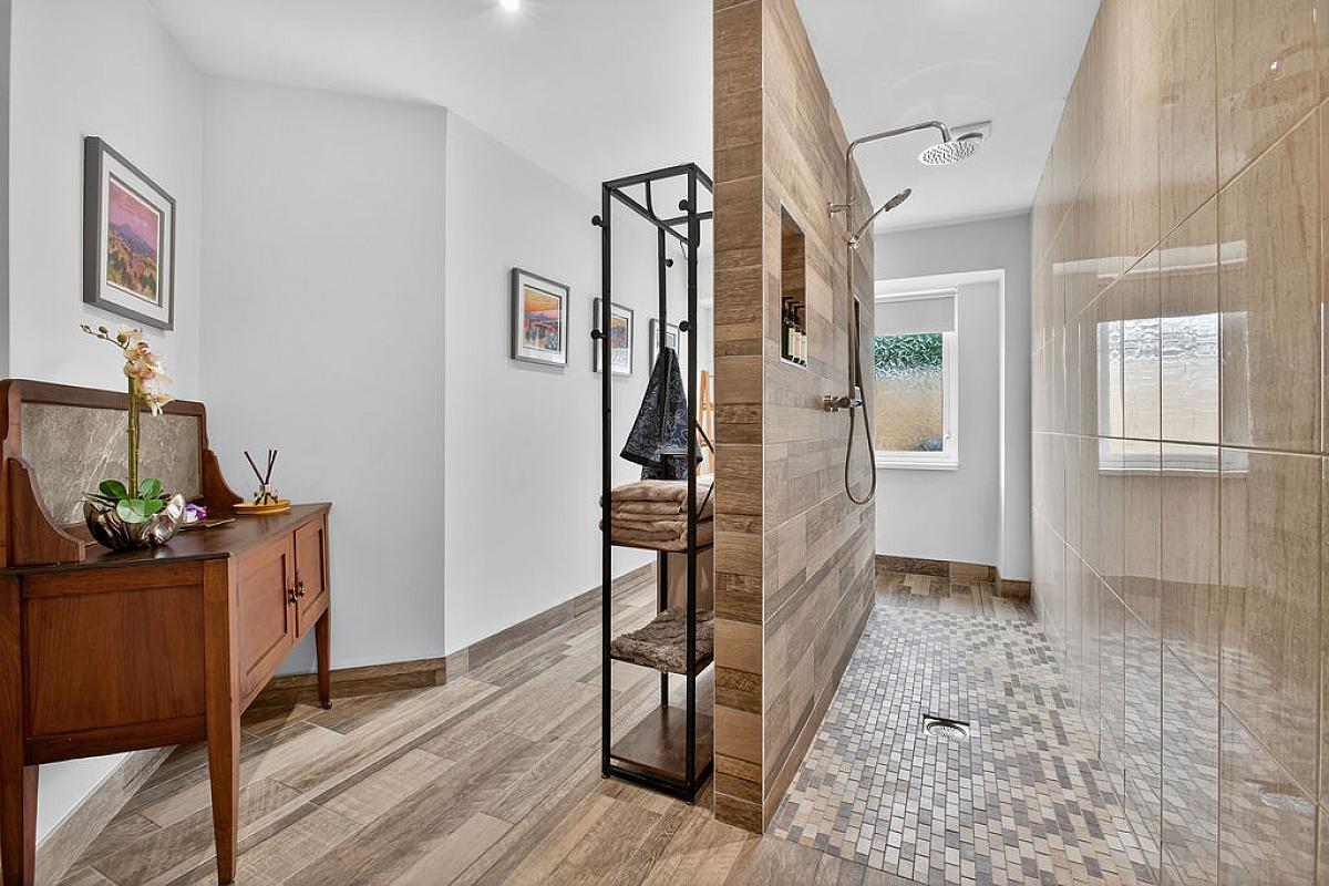 Tiled floor and part filed walls, his and her wash hand basins, low flush WC, walkin in shower area with rain water head