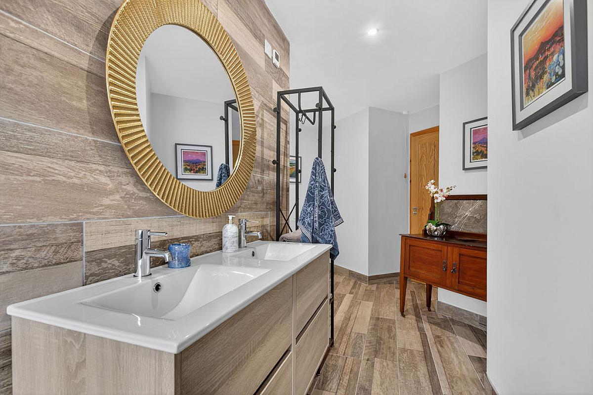 Tiled floor, part tiled walls, curved bath, low flush WC, vanity unit with storage under