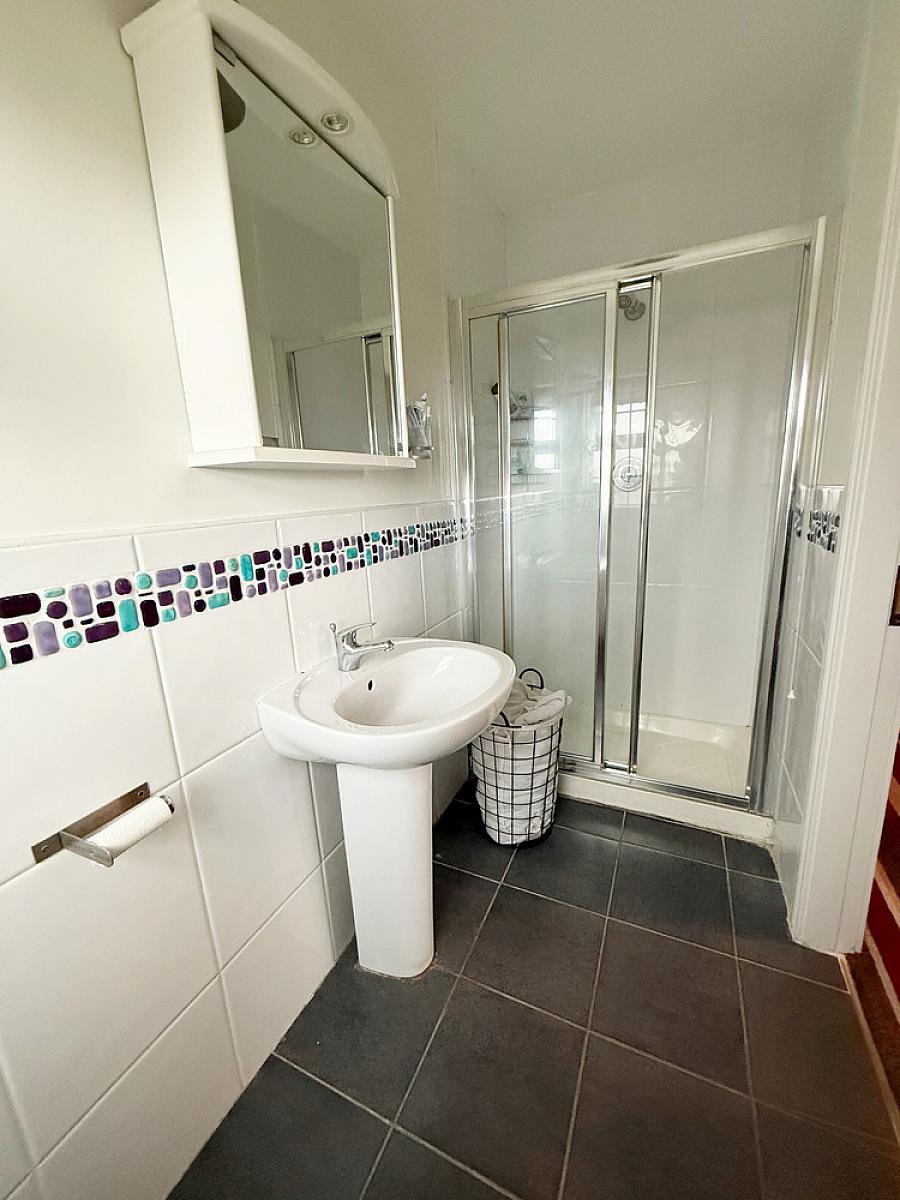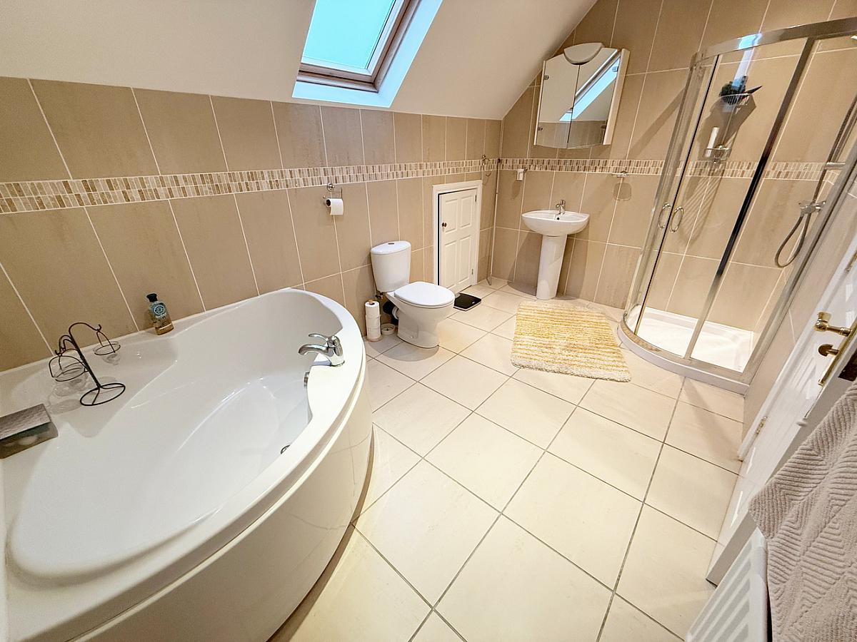 Comprising corner bath, tiled shower cubicle with mains shower, low flush WC and wash hand basin. Fully tiled walls and tiled floor. Velux window.