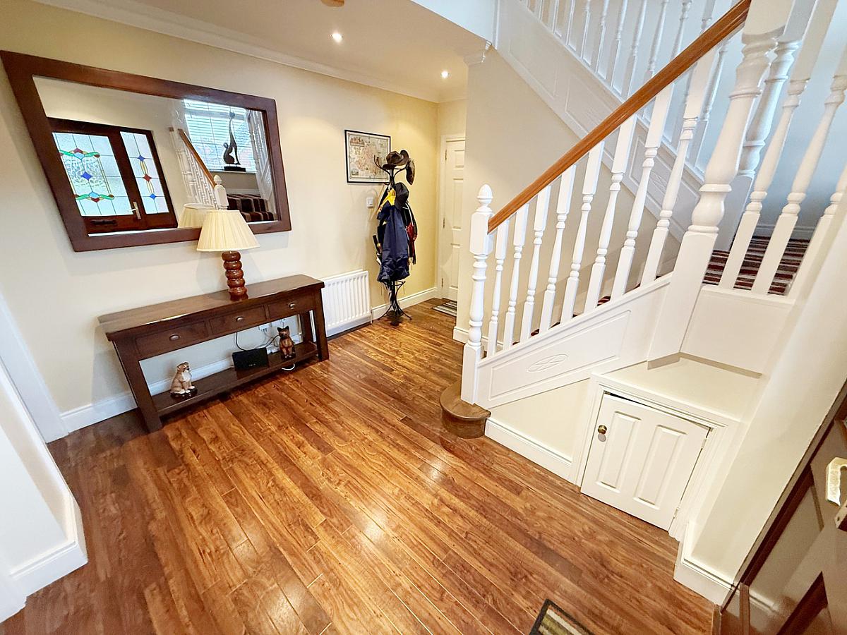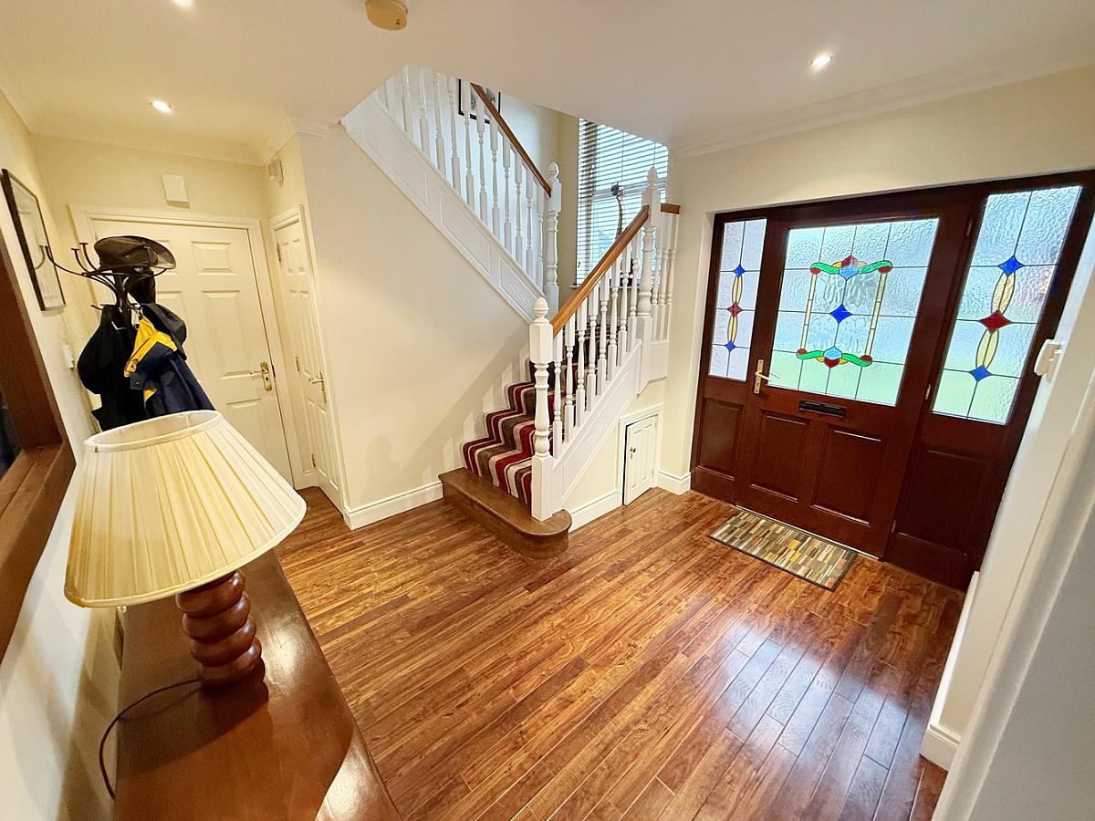 Glass panel front door, Karndean floor. Alarm Panel. Access through to garage.