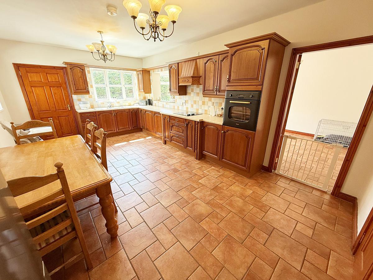 Tiled floor with part tiled walls, high and low level storage units. Integrated oven and hob and single stainless steel sink unit. Access through to utility room and dining/sun room.
