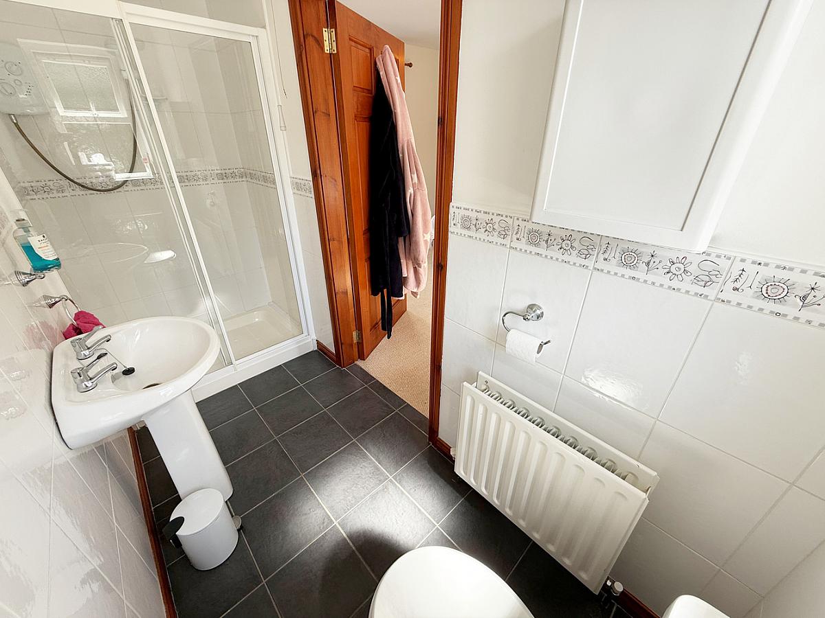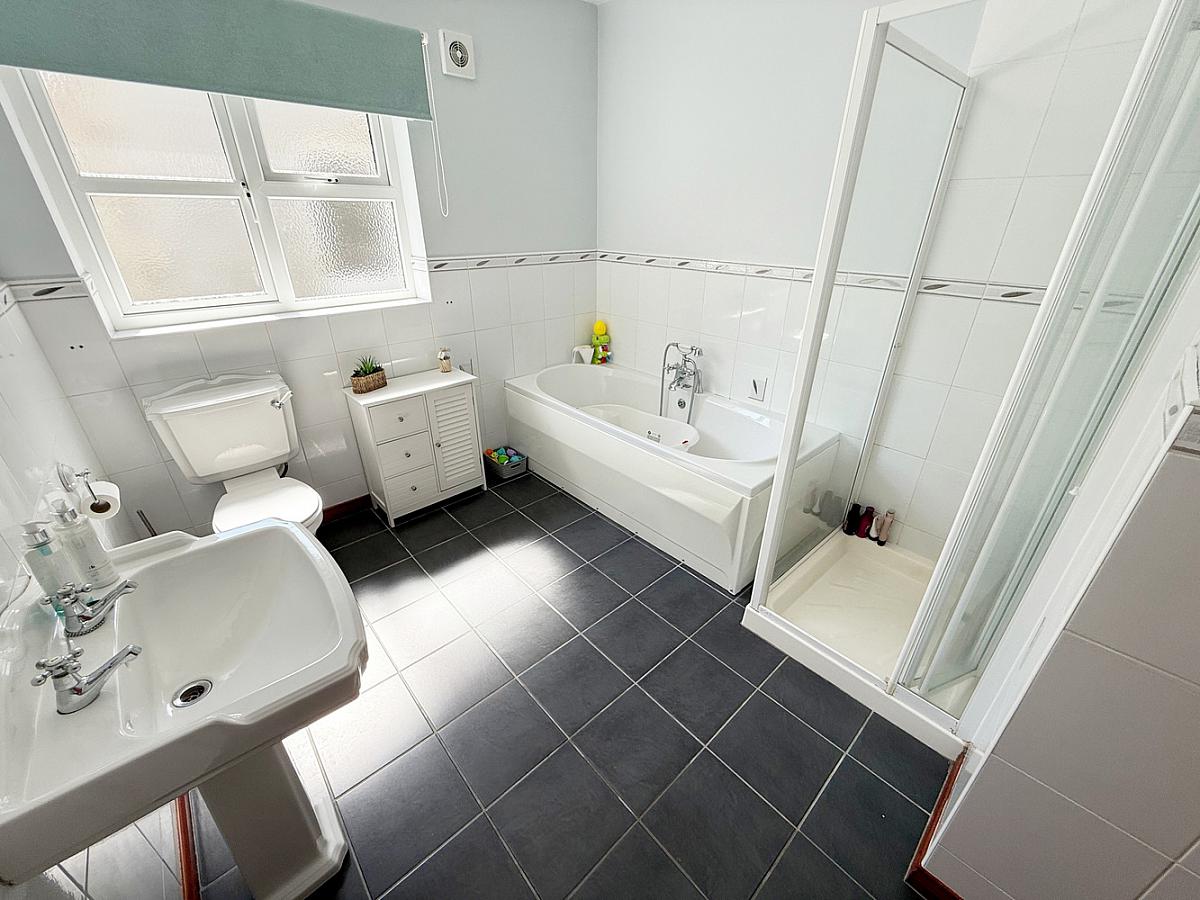 Tiled floor and part tiled walls. Panel bath with mixer taps and shower attachment. Tiled shower cubicle with electric shower, low flush WC and wash hand basin.