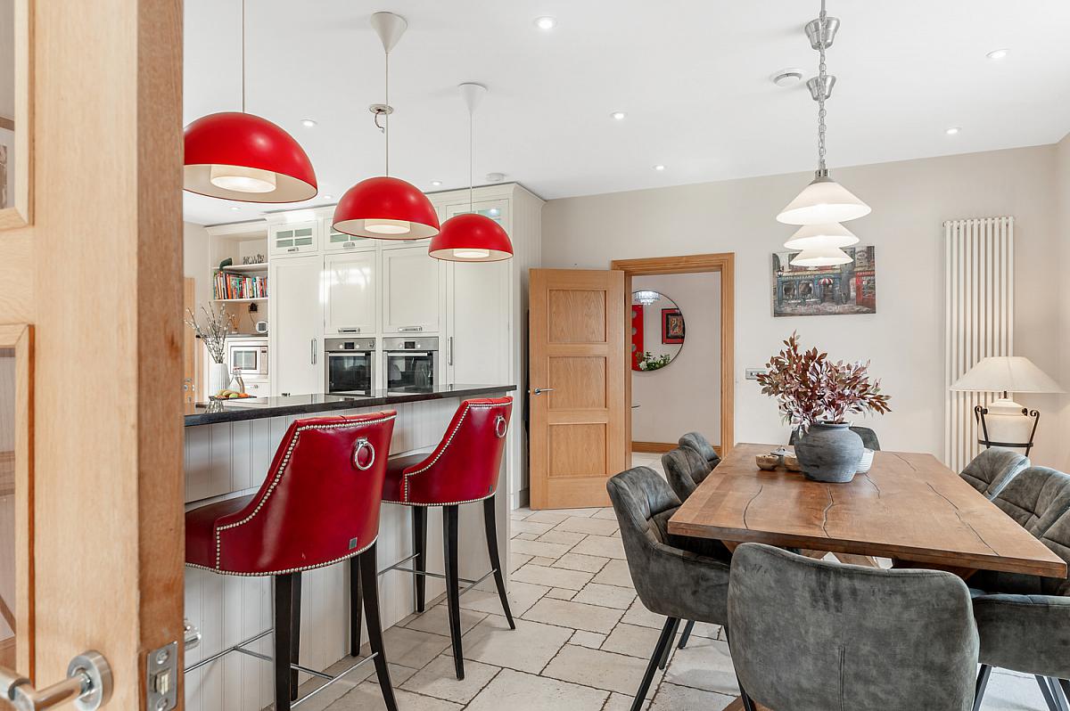 Stylish kitchen/dining area with central island and integrated appliances