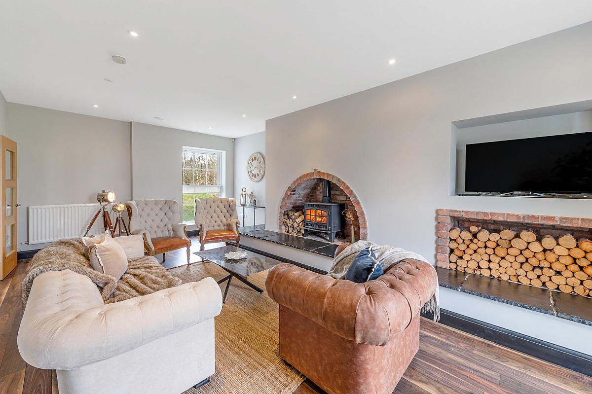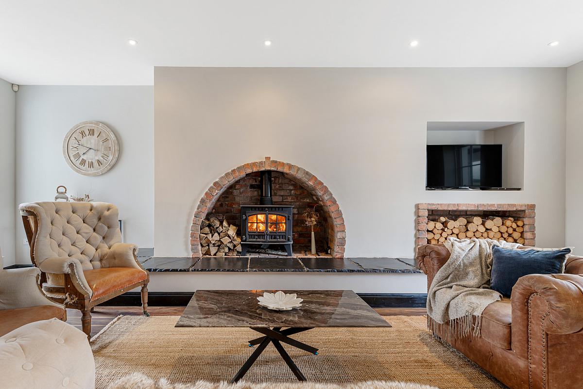 Raised inglenook brick fireplace with multi fuel stove, slate tiled hearth and log storage.