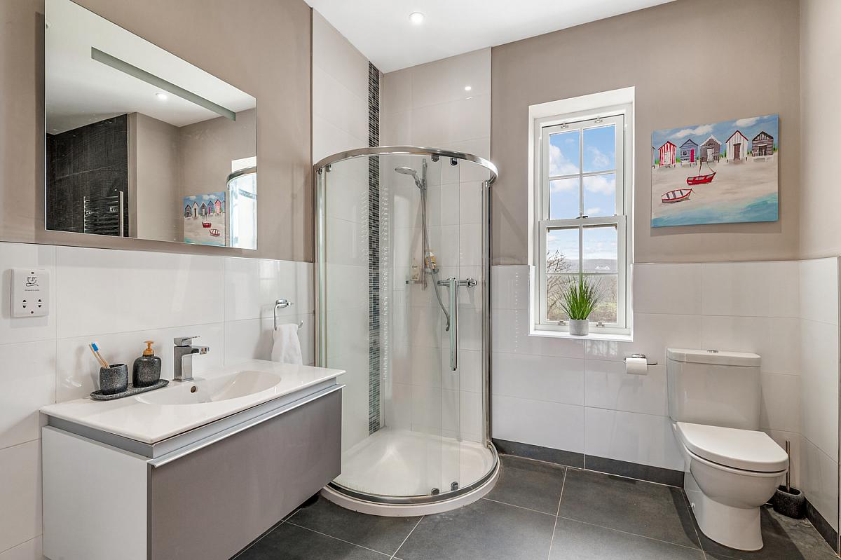 Comprising fully tiled walk in shower with mains shower. Wash hand basin in vanity unit with storage, low flush WC and heated towel rail. Tiled walls and tiled floor.