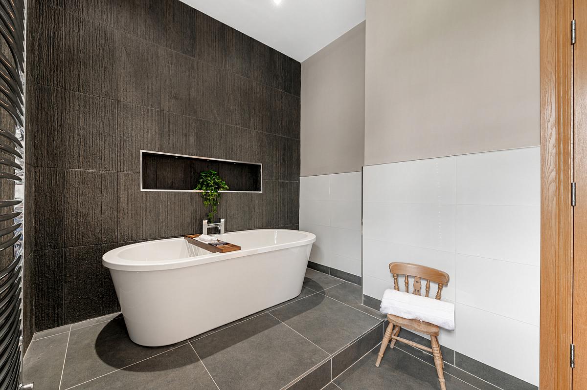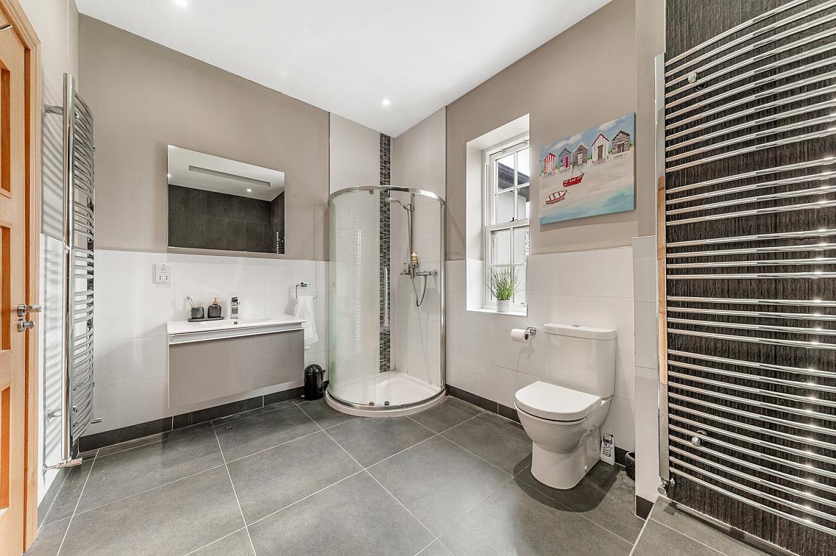 Comprising free standing bath with mixer taps, corner tiled shower cubicle with mains shower, wash hand basin in vanity unit and low flush WC. Heated towel rail, part tiled walls and tiled floor.