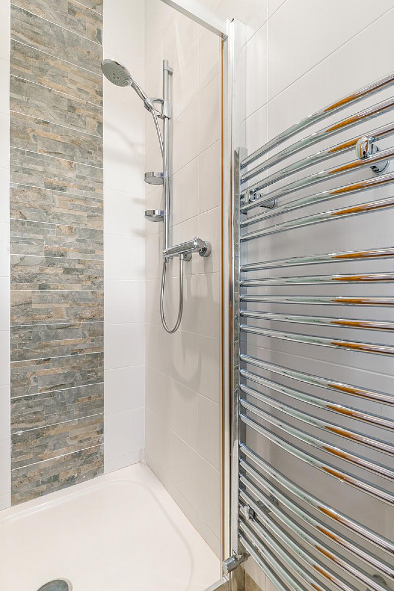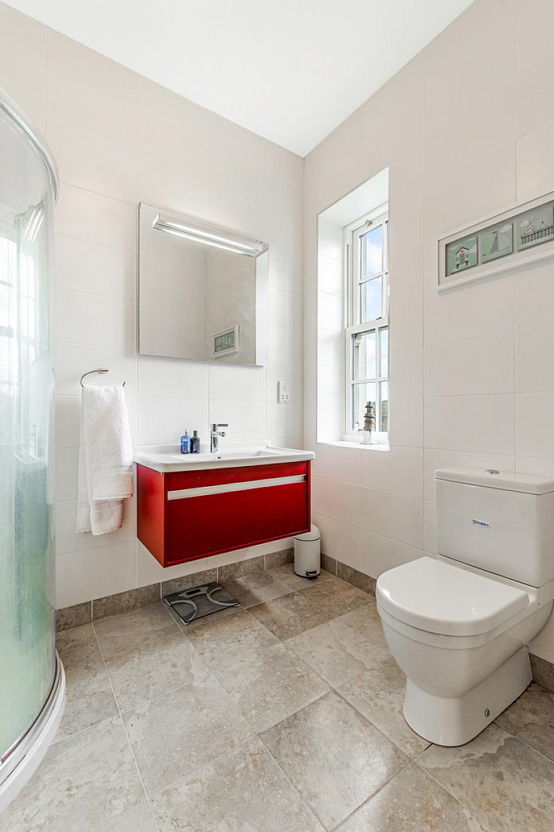 Comprising tiled shower cubicle with mains shower, low flush WC and wash hand basin. Heated towel rail and tiled floor.
