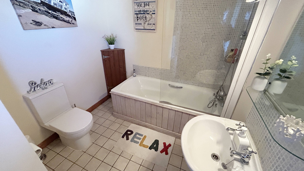 Tiled floor , low flush WC, pedestal wash hand basin and panel bath with mains shower over.