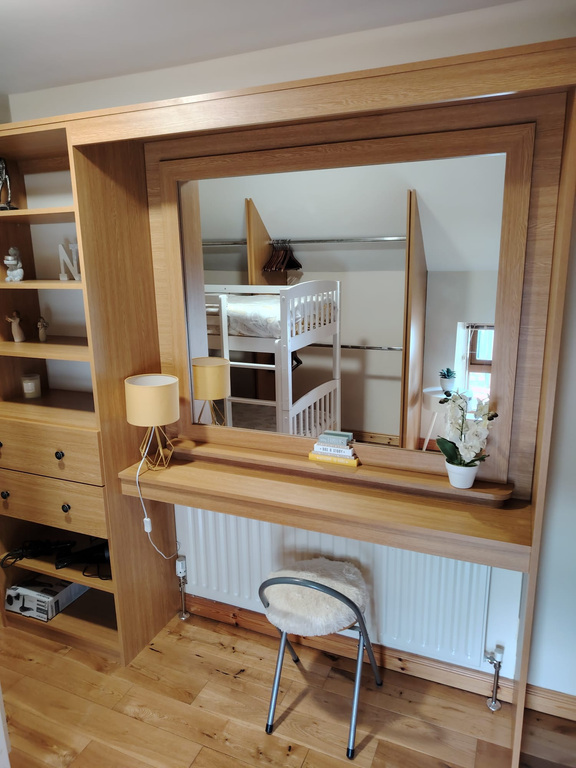 High and low level storage units with solid wood doors. Integrated oven, hob and extractor fan. Single stainless steel sink unit, plumbed for washing machine and plumbed for dish washer. Space for fridge freezer, hot press and storage. Access to rear.