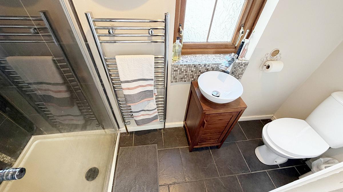 Tiled floor, heated towel rail, shower cubicle electric shower, wash hand basin vanity unit, low flush WC.