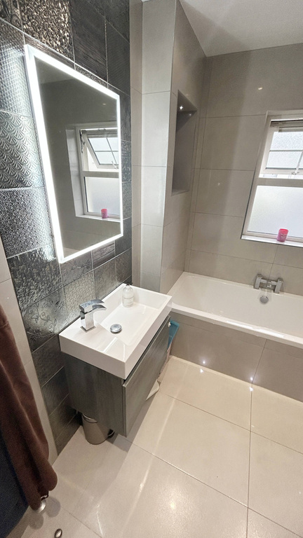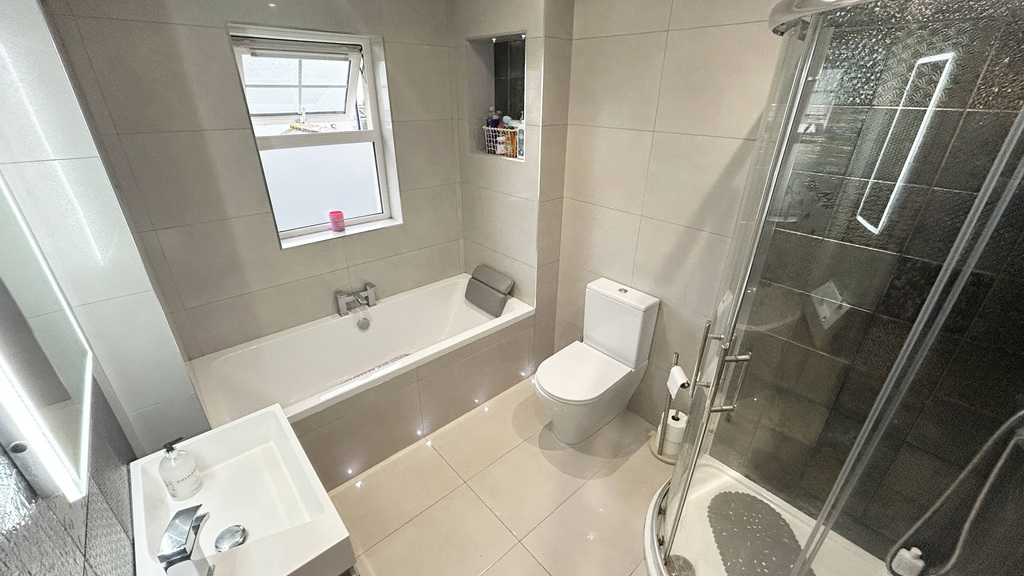 Stunning bathroom suite only finished in April 2018. Tiled floor and tiled walls, bath, low flush WC, cantilevered wash hand basin and vanity unit, shower cubicle with mains shower, heated towel rail. LED lighting to floor and recessed lighting to ceiling.