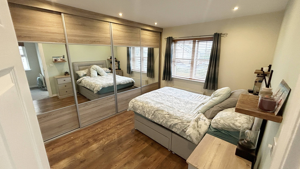 Double room to front with laminate wood flooring and television point. New bespoke fitted wardrobed with shelving , rails and television unit.