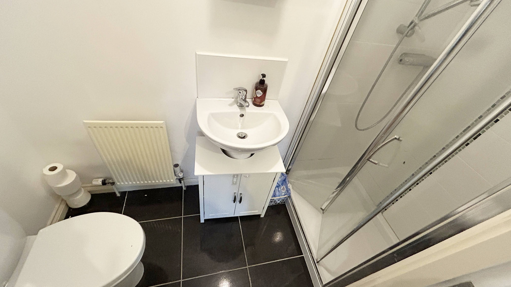 ENSUITE comprising a low flush WC, pedestal wash hand basin, shower cubicle with mains shower.