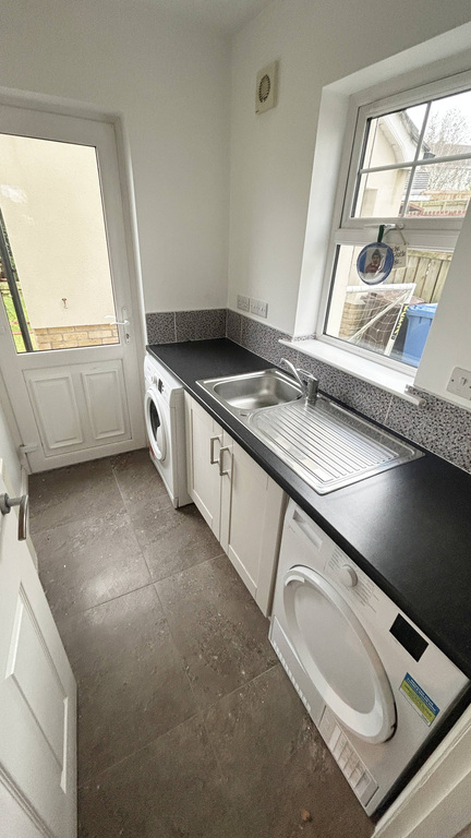 Tiled floor, high and low level storage units. Plumbed for washing machine and space for a tumble drier. Stainless steel sink and drainer unit. Access to rear garden.