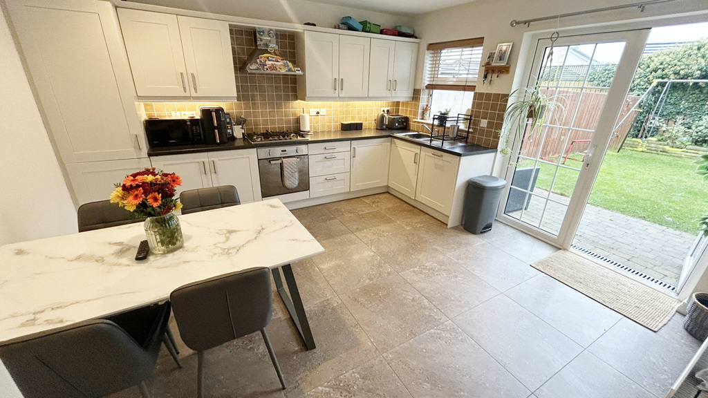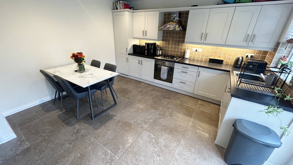 Tiled floor, high and low level storage units (repainted in 2025). Integrated fridge freezer, integrated dishwasher, integrated oven and gas hob. Stainless steel sink and drainer unit, television point, patio doors to rear garden.