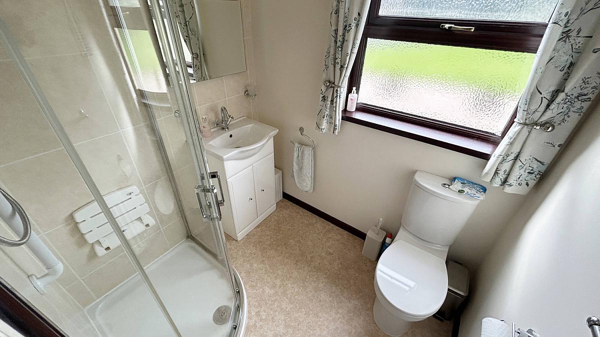 Shower cubicle with electric shower, vanity unit wash hand basin, low flush WC