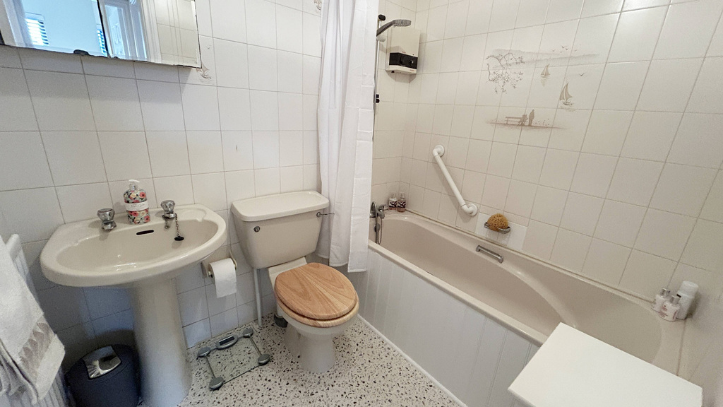 Fully tiled walls, pedestal wash hand basin, low flush WC, panel bath with electric shower over