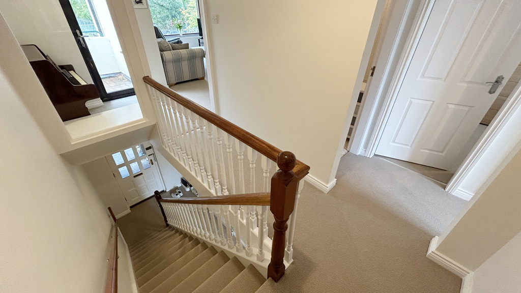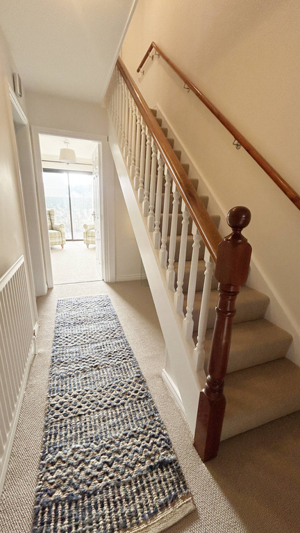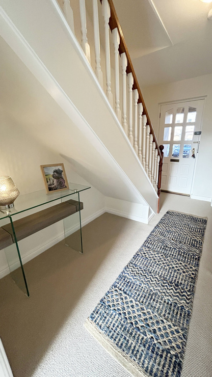Solid wood and glass panel door., telephone point, understairs storage area (open)