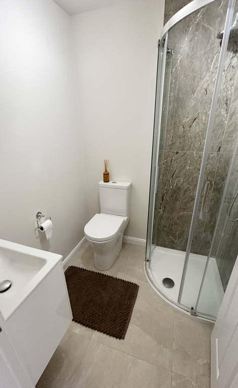 Low flush WC, shower cubicle with mains shower, vanity unit wash hand basin, tiled floor