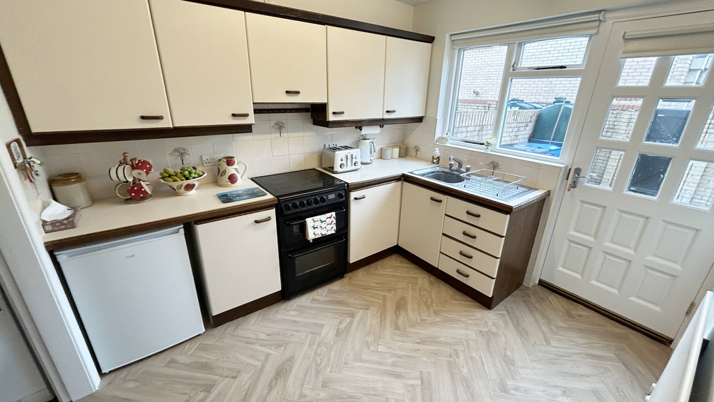High and low level storage units, stainless steel sink and drainer unit. Space for fridge, space for free standing cooker. Storage cupboard. Access to rear garden and utility room.