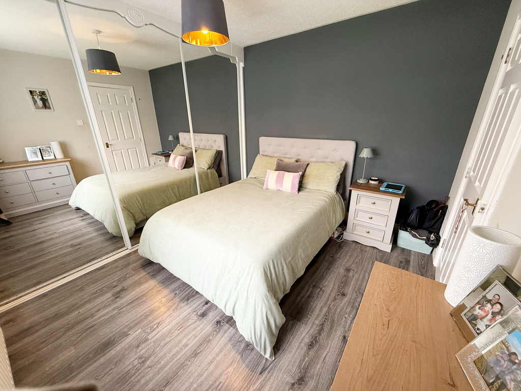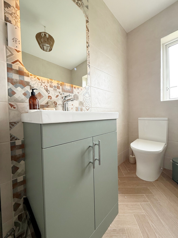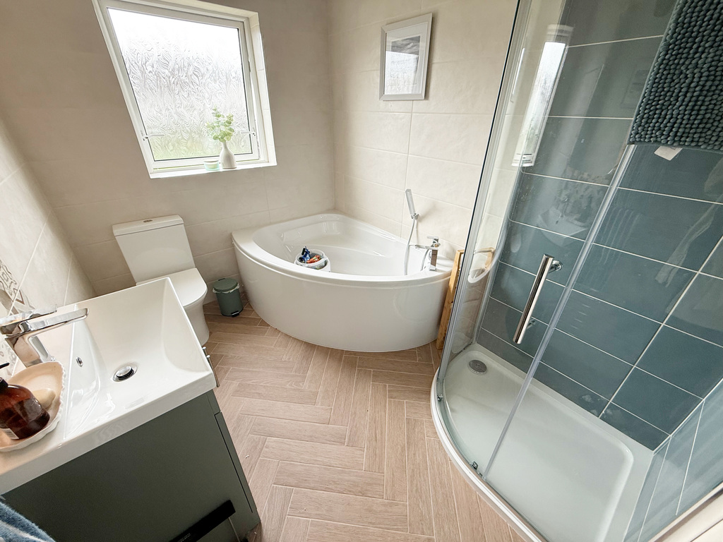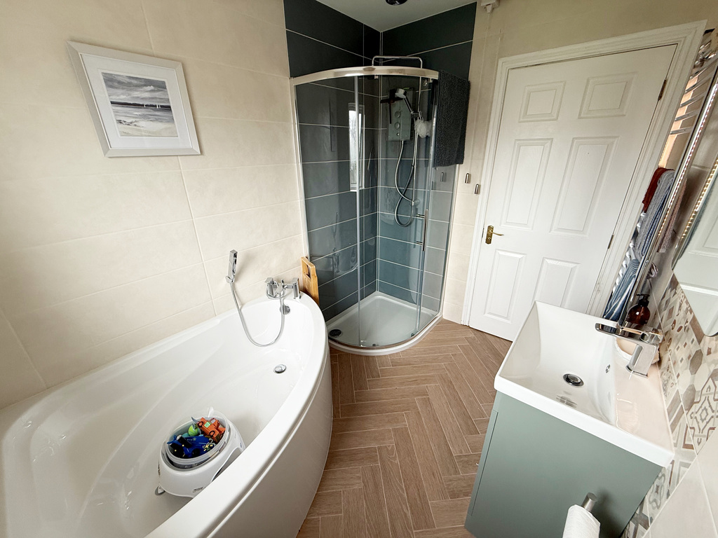 Newly fitted suite comprising, corner bath with mixer taps and shower attachment. Tiled shower cubicle with electric shower, wash hand basin in vanity unit with storage and mirrored light. Heated towel rail. Tiled walls and tiled floor.